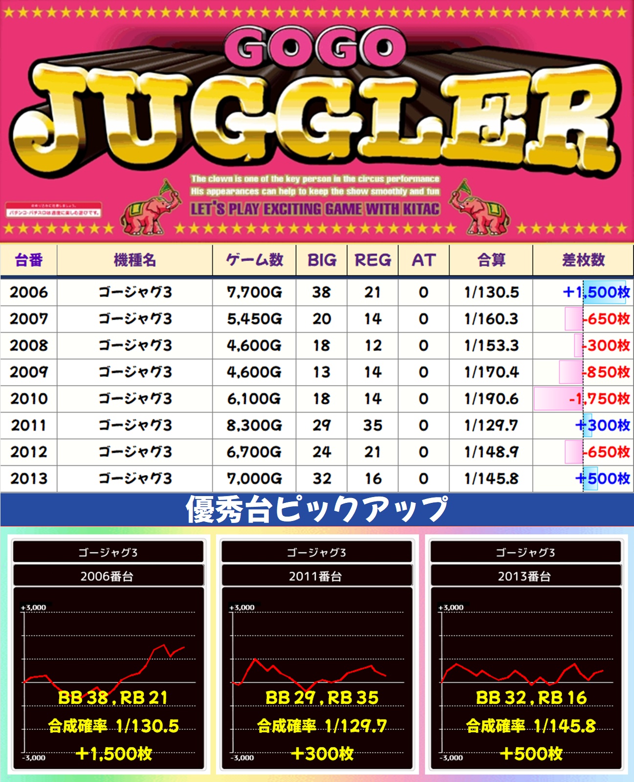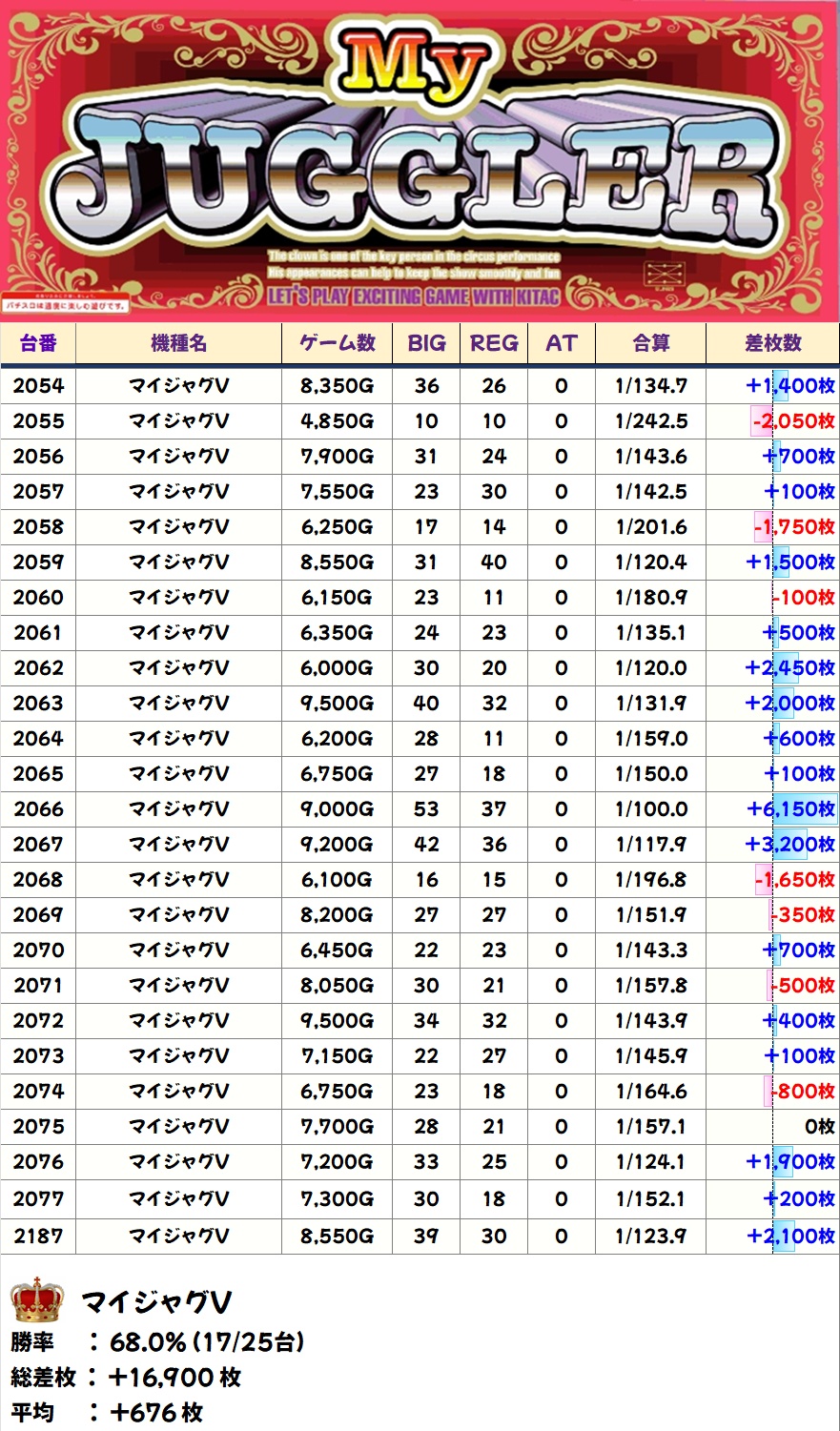全台系濃厚のジャグラーガールズ以外にもジャグラーシリーズは全体的に優秀台が多めになっており、シリーズ総差枚は+3万枚オーバー、台平均+454枚という素晴らしい結果でした。ココからは毎回高配分以上の優秀機種が多数出現していますが、今回も厚めの仕掛けになっていたようです。
