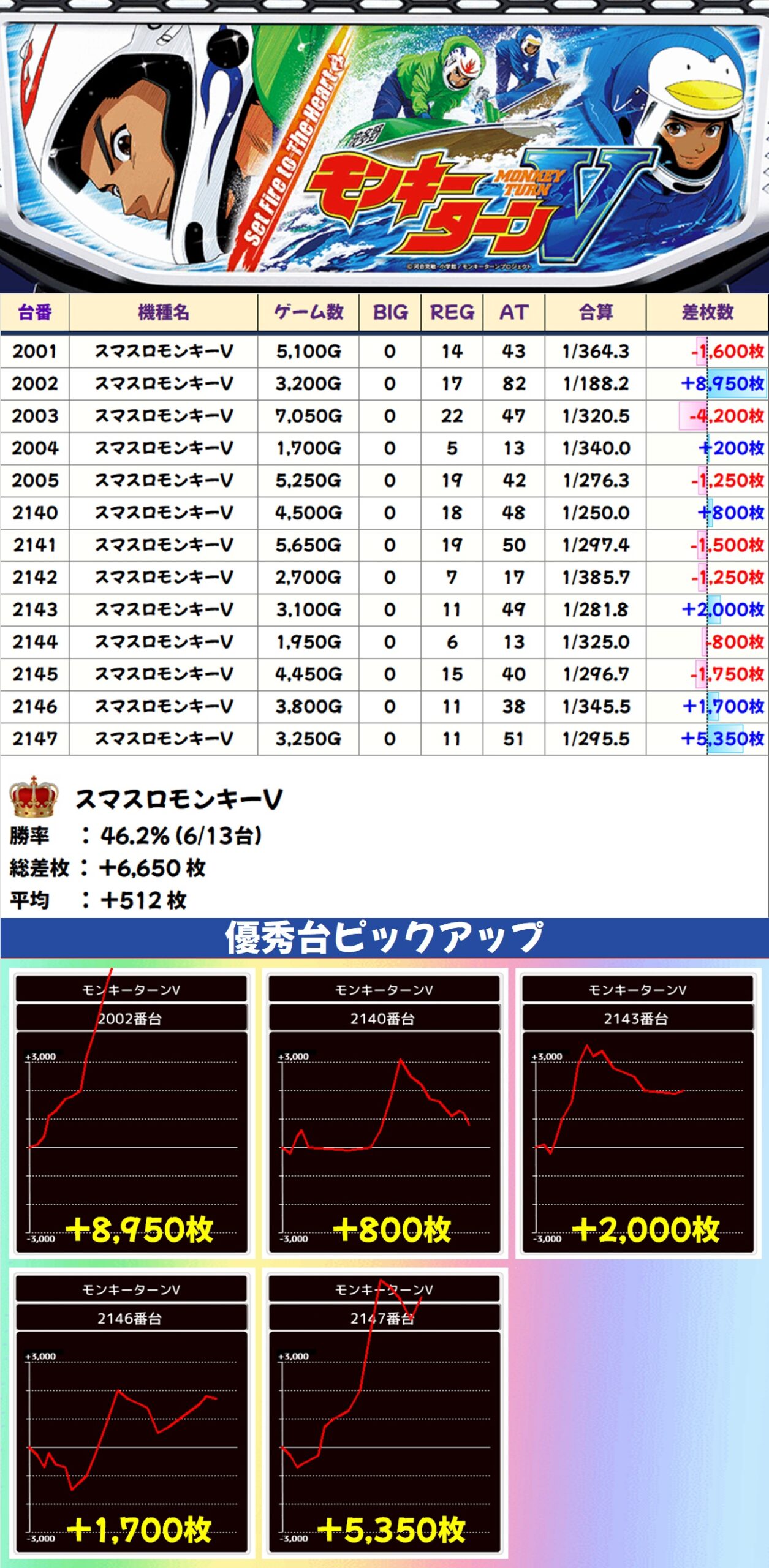 スマスロモンキーV(6/13台+)➡平均+512枚