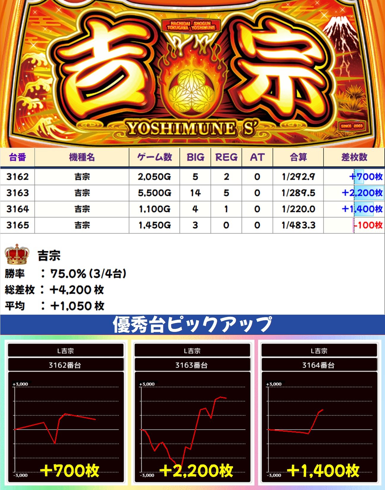 吉宗(3/4台+)➡平均+1,050枚