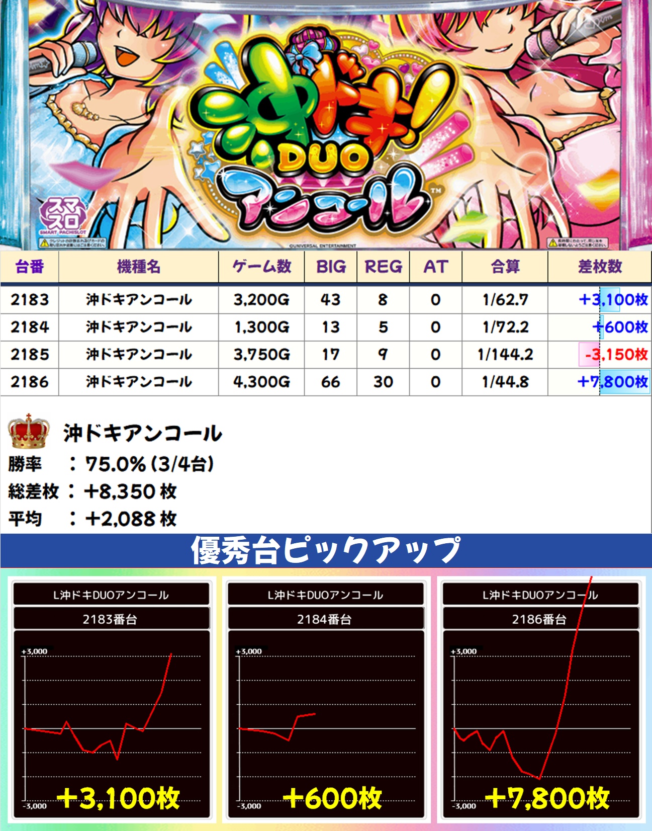 沖ドキアンコール(3/4台+)➡平均+2,088枚