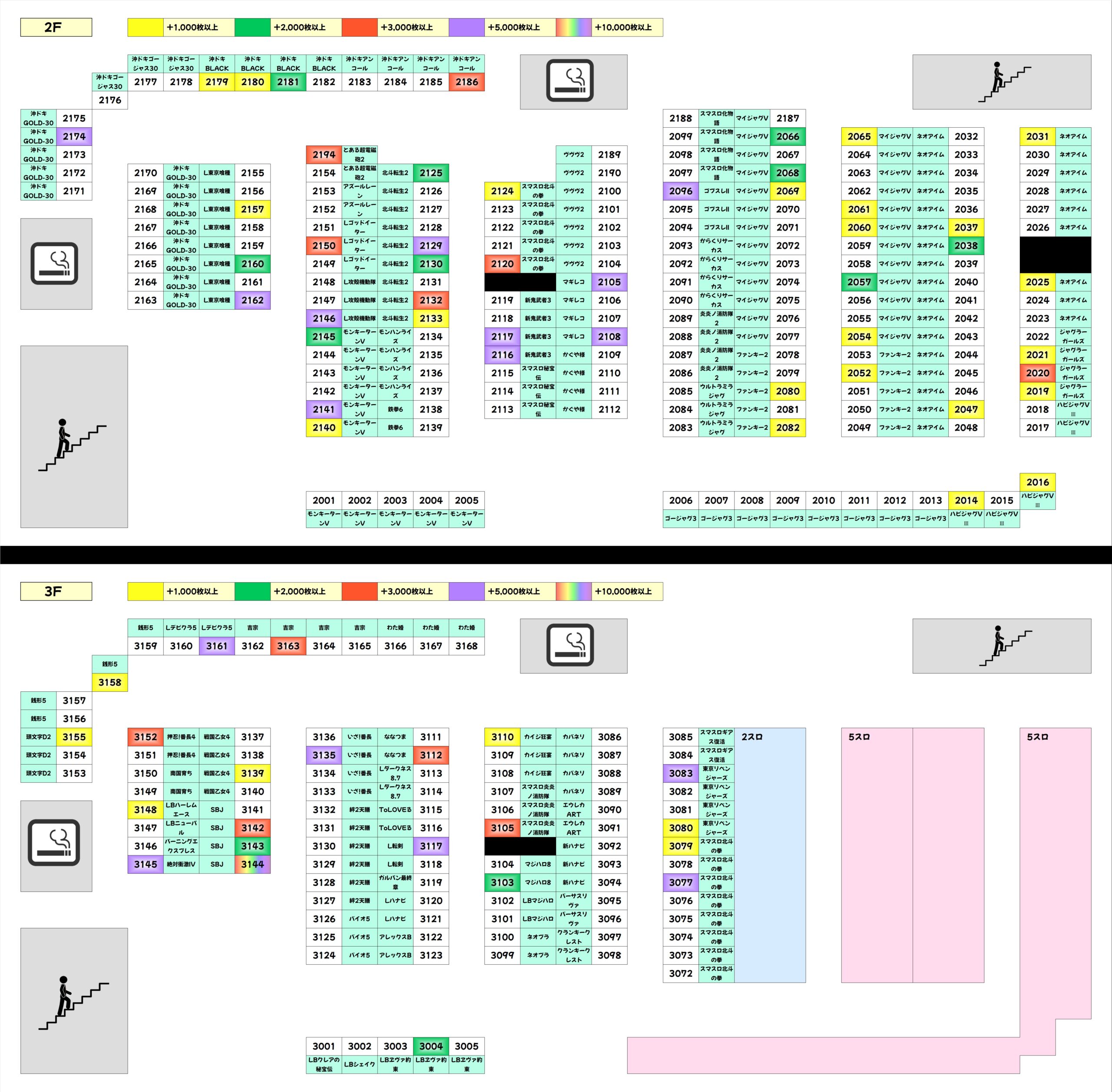 3Fからも高配分以上濃厚の好調機種が多数出現。スマスロ北斗は2Fだけでなく3Fも仕掛け対象になっていたようで、+6,000枚オーバー台を筆頭に半数がプラス差枚に。少台数機種も数多くの優秀台が確認でき、全体的に盛り上がっていました。