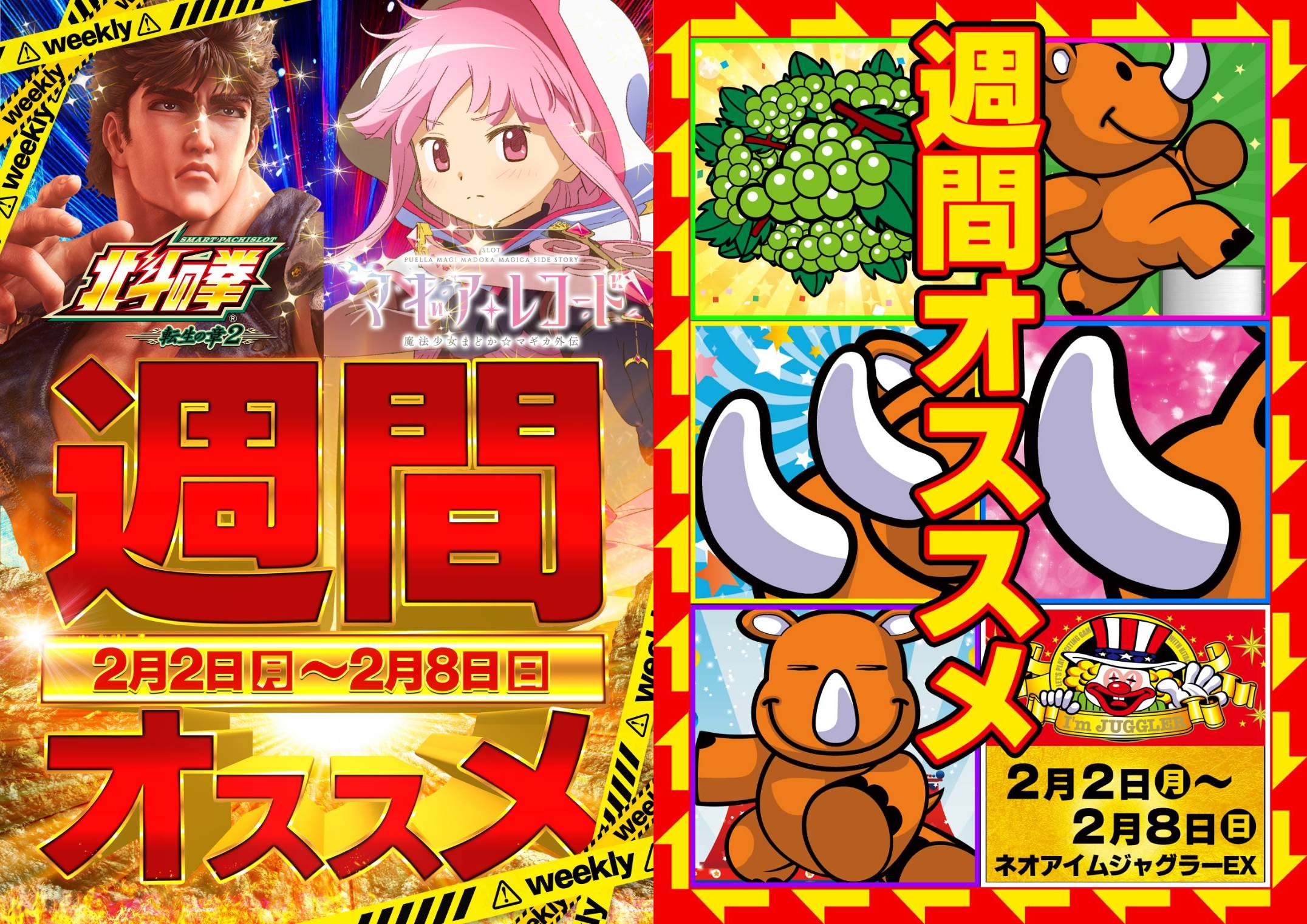 1/2系以上濃厚機種も多数出現。今回はオススメ機種への仕掛けが目立ち、月間オススメ機種は東京喰種、ジャグラーシリーズではマイジャグV・ハピジャグが好調。週間オススメ機種は北斗転生2が平均+1,500枚、マギレコが平均約+3,000枚とかなり優秀でした。