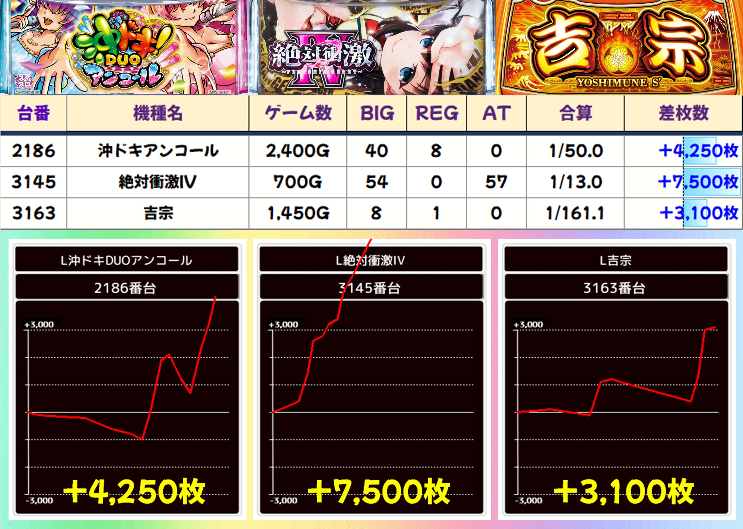 仕掛け外の機種にも大量出玉の優秀台を確認。絶対衝激Ⅳには+7,000枚オーバー台が、沖ドキアンコールには+4,000枚オーバー台が、吉宗に+3,000枚オーバー台があったりと、満遍なくお宝が投入されていた様子が窺えます。