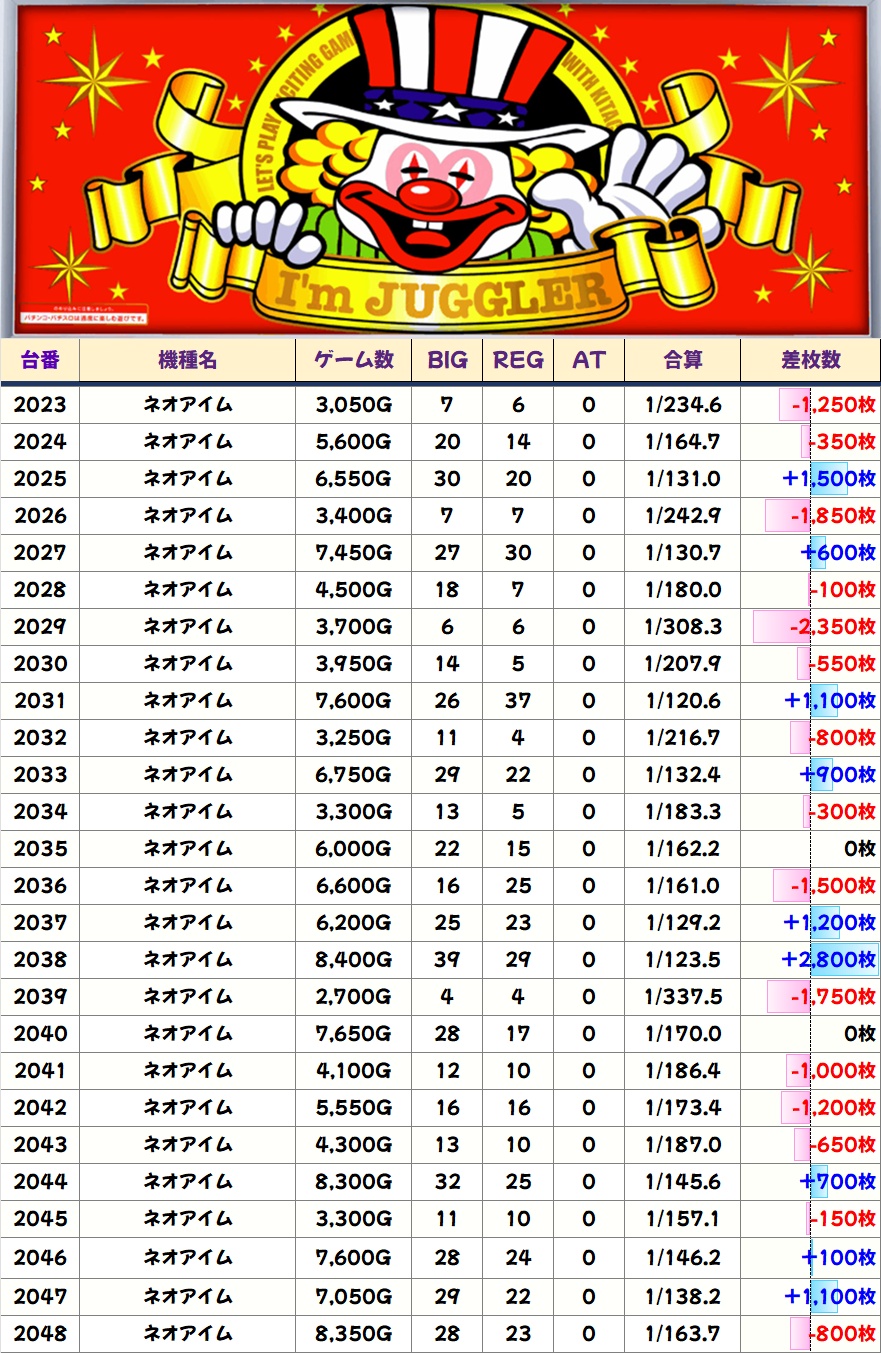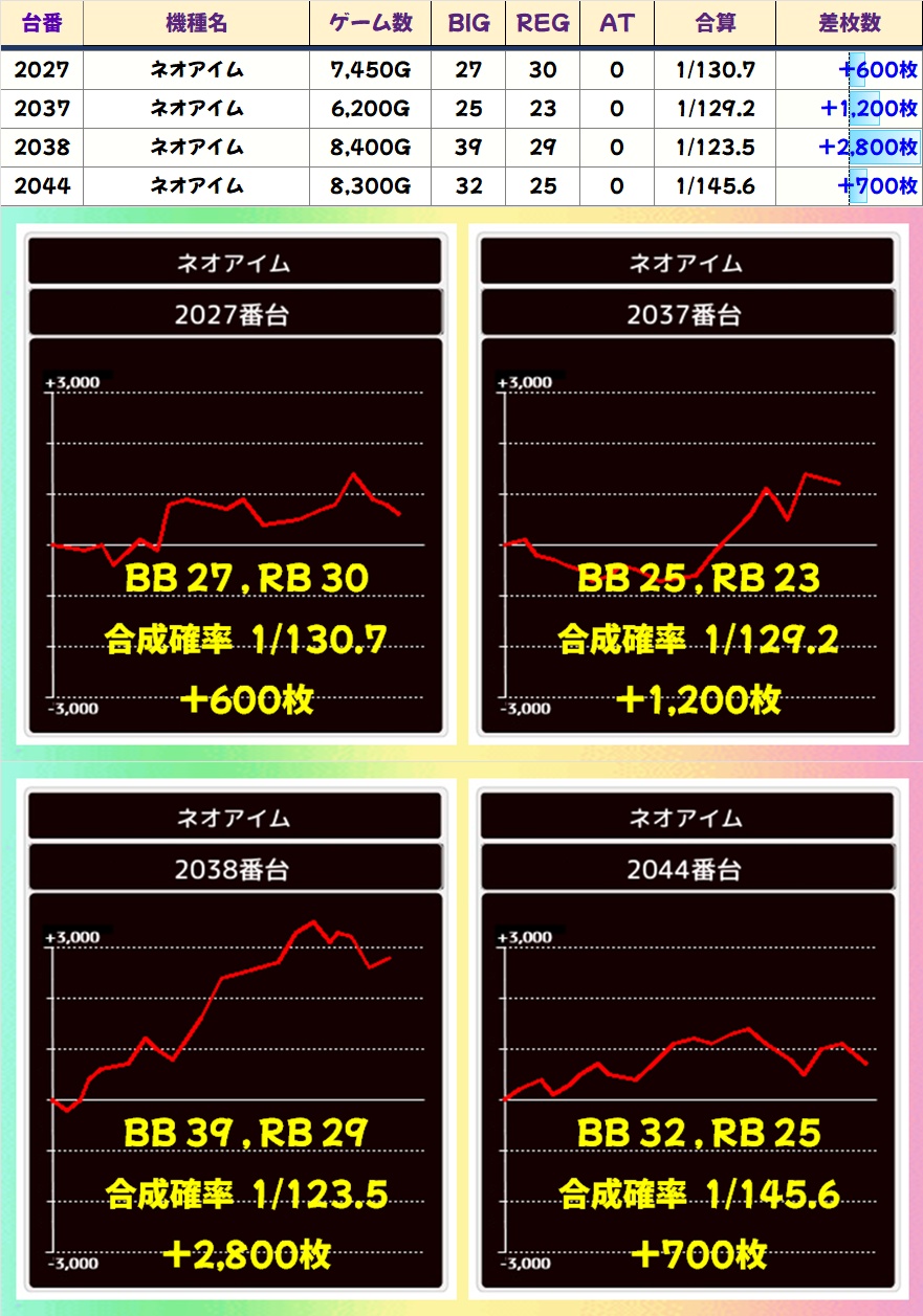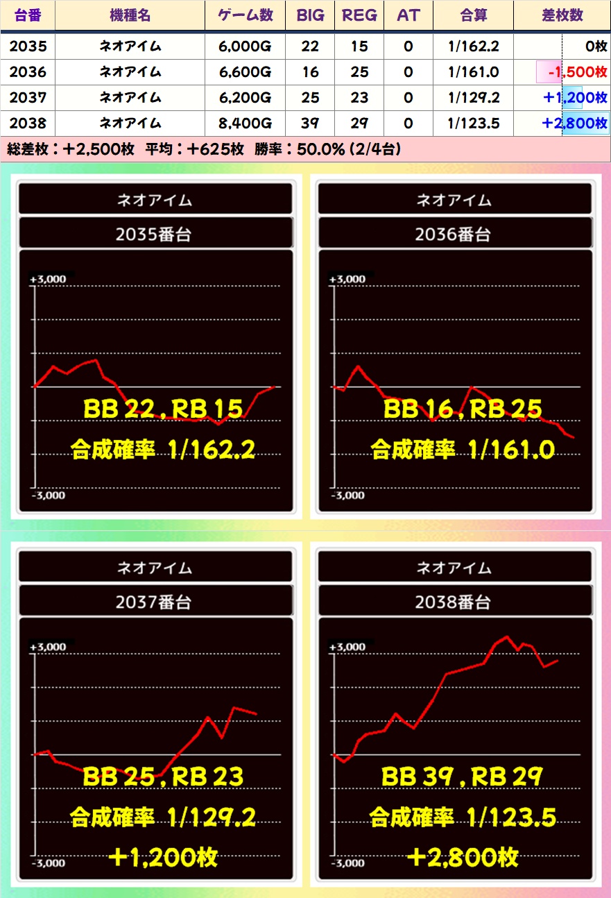 やや不発ぎみな印象はありますが、2035~3038番台が並びで好調な雰囲気。2036番台はBIGのヒキに恵まれずマイナスに終わりましたが、REG出現率は高設定域だったので当たりだった可能性が高いです。
