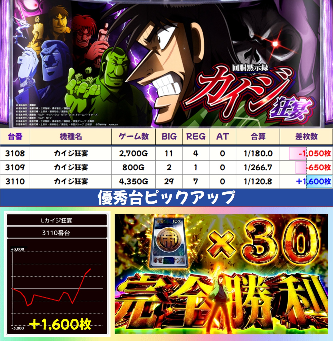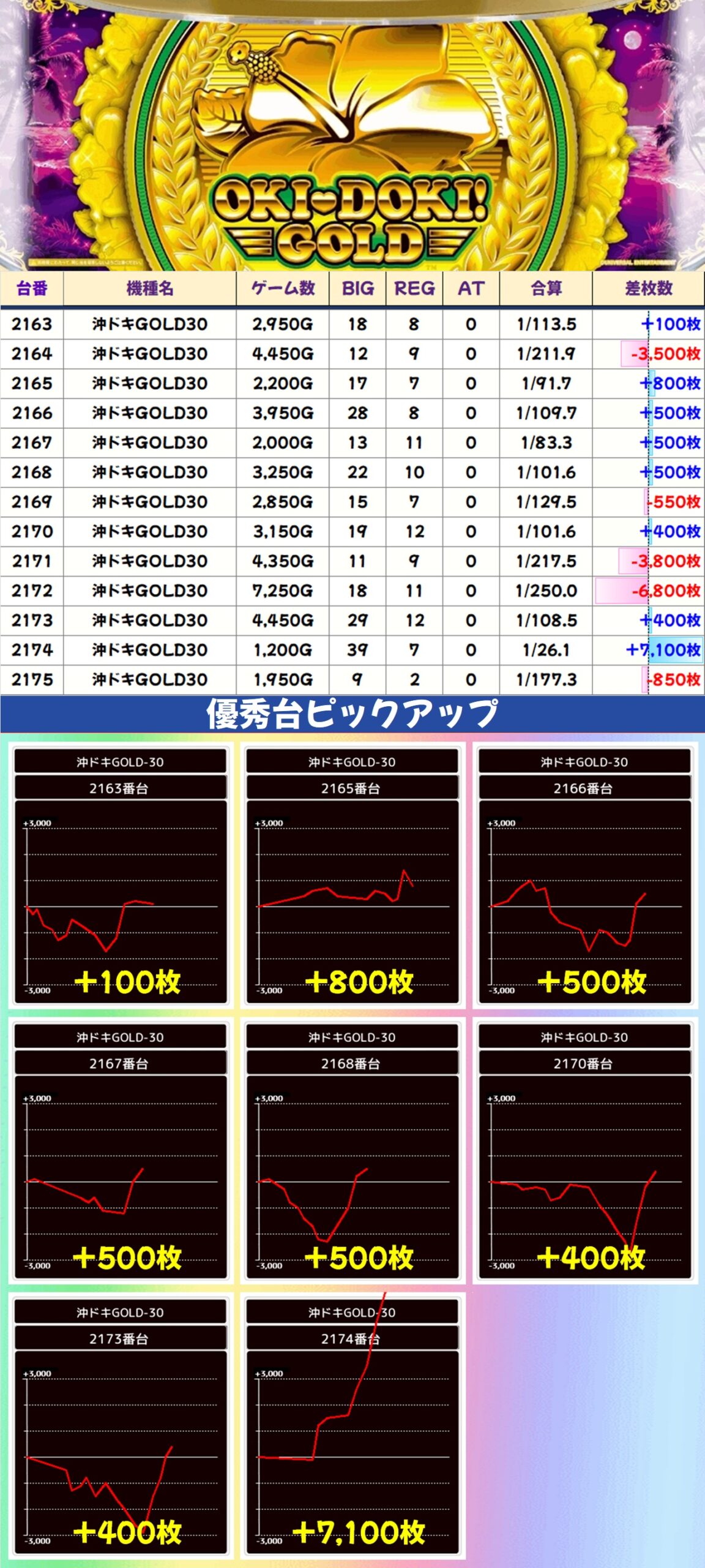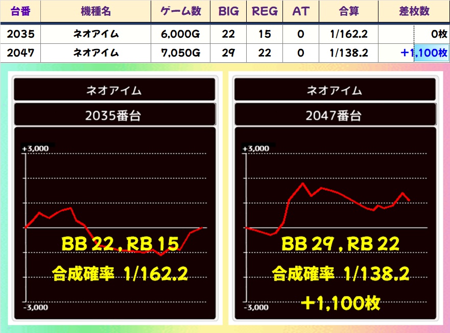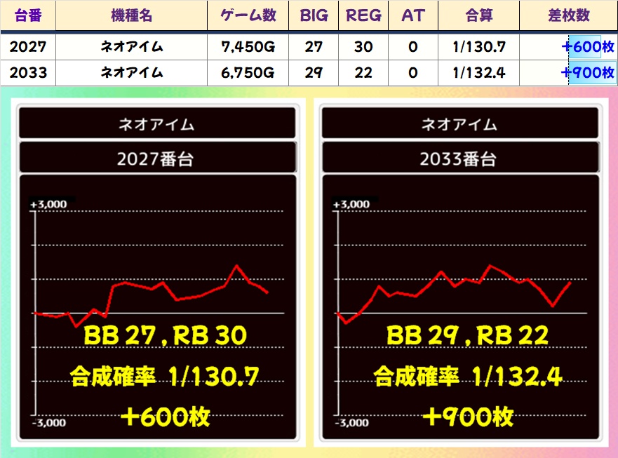 やや不発ぎみな印象はありますが、2035~3038番台が並びで好調な雰囲気。2036番台はBIGのヒキに恵まれずマイナスに終わりましたが、REG出現率は高設定域だったので当たりだった可能性が高いです。