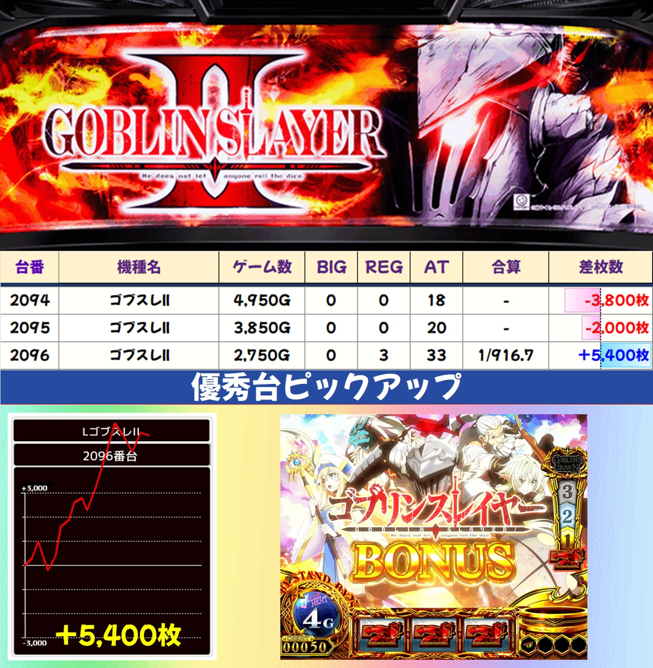 2Fは月間オススメ機種のモンキーターンV、週間オススメ機種のネオアイムなどを筆頭に、多くの機種が高配分以上と思われる結果に。新台の攻殻機動隊やゴブスレⅡにも優秀台が散見され、主要機種を中心に幅広くお宝が散りばめられていたようです。