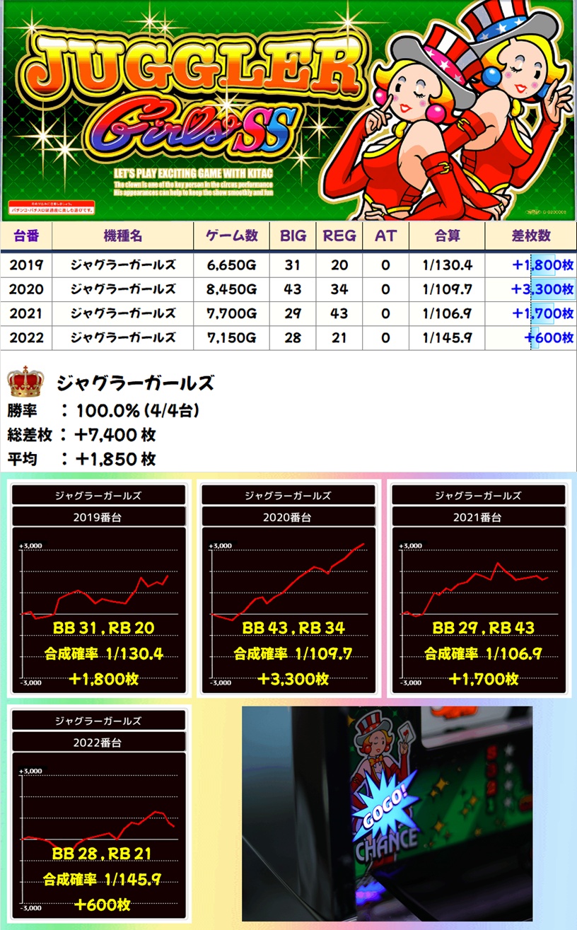 ジャグラーガールズ(4/4台+)➡平均+1,850枚