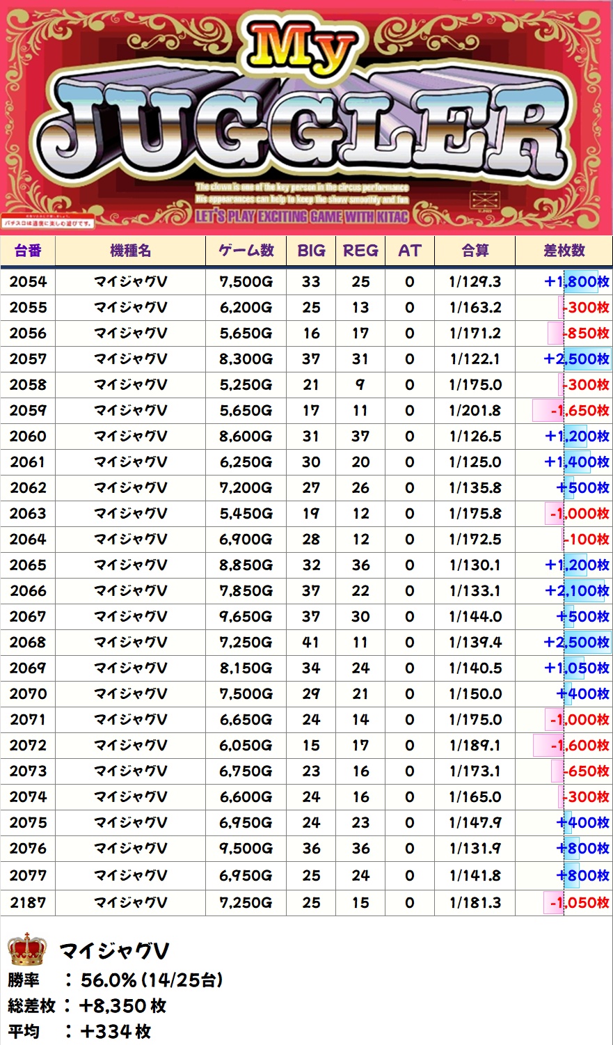 マイジャグV(14/25台+)➡平均+334枚