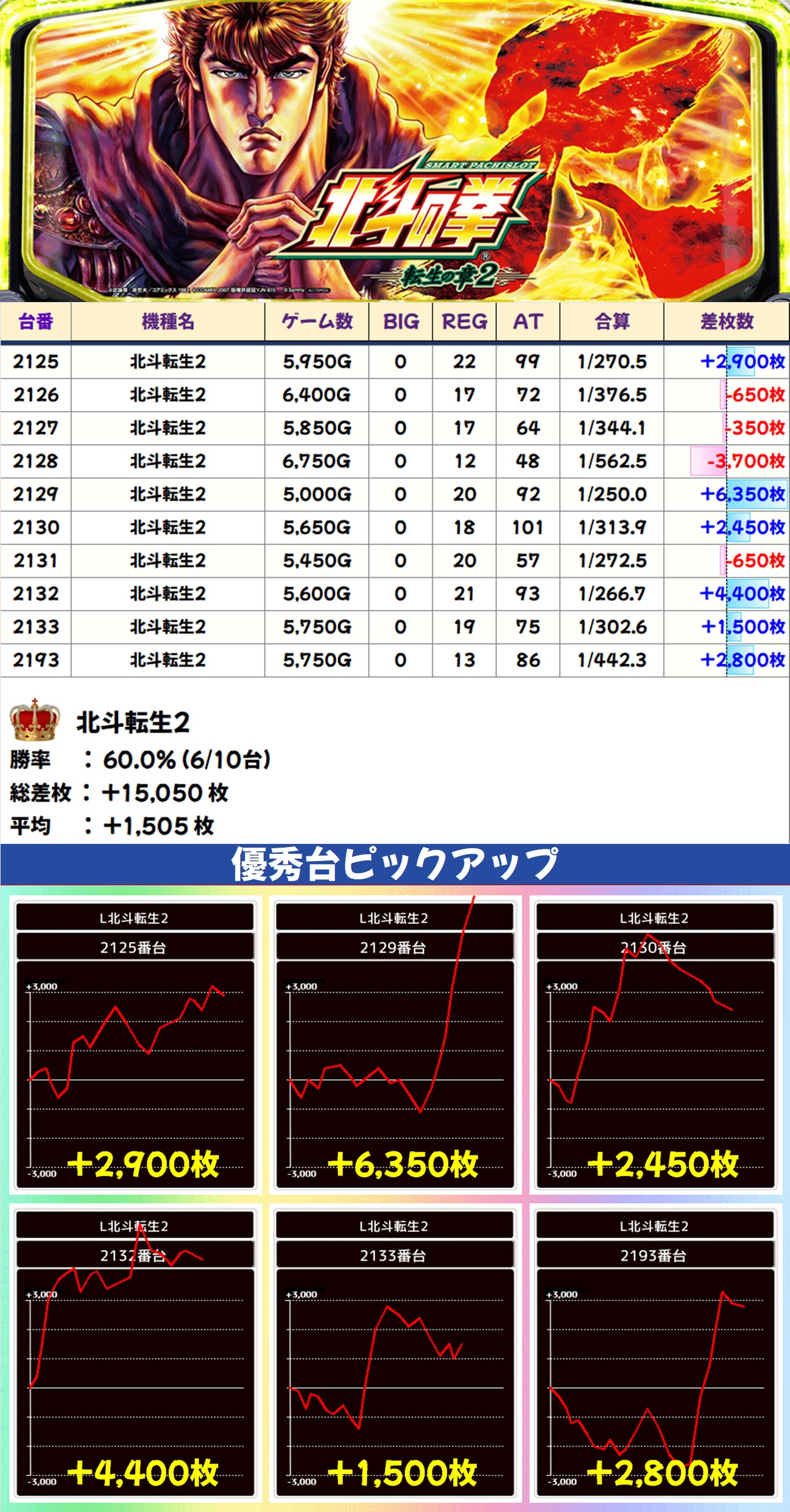 北斗転生2(6/10台+)➡平均+1,505枚