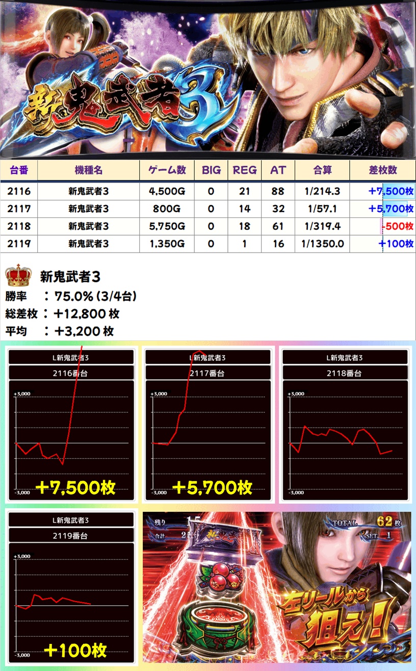 新鬼武者3(3/4台+)➡平均+3,200枚