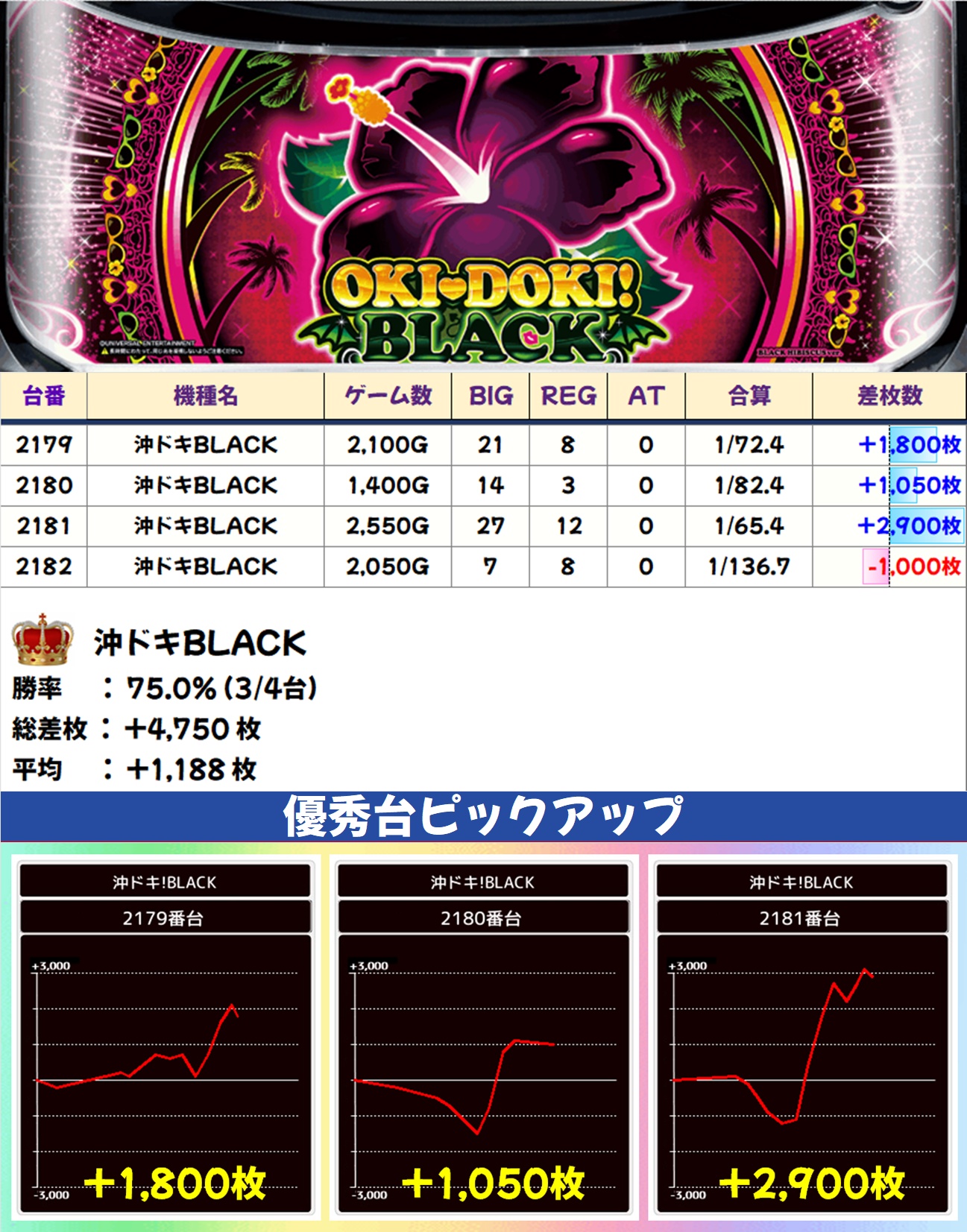 沖ドキBLACK(3/4台+)➡平均+1,188枚
