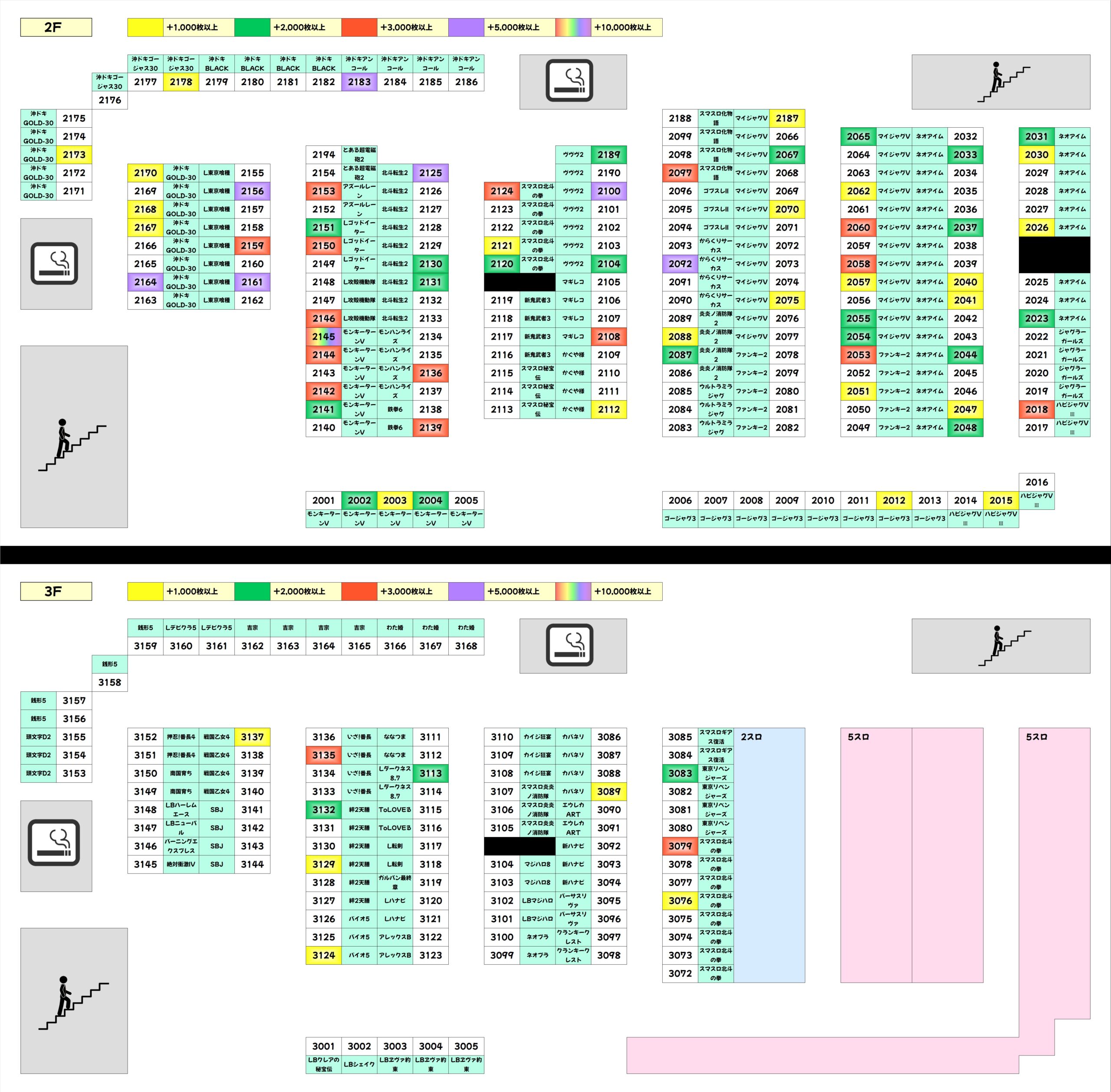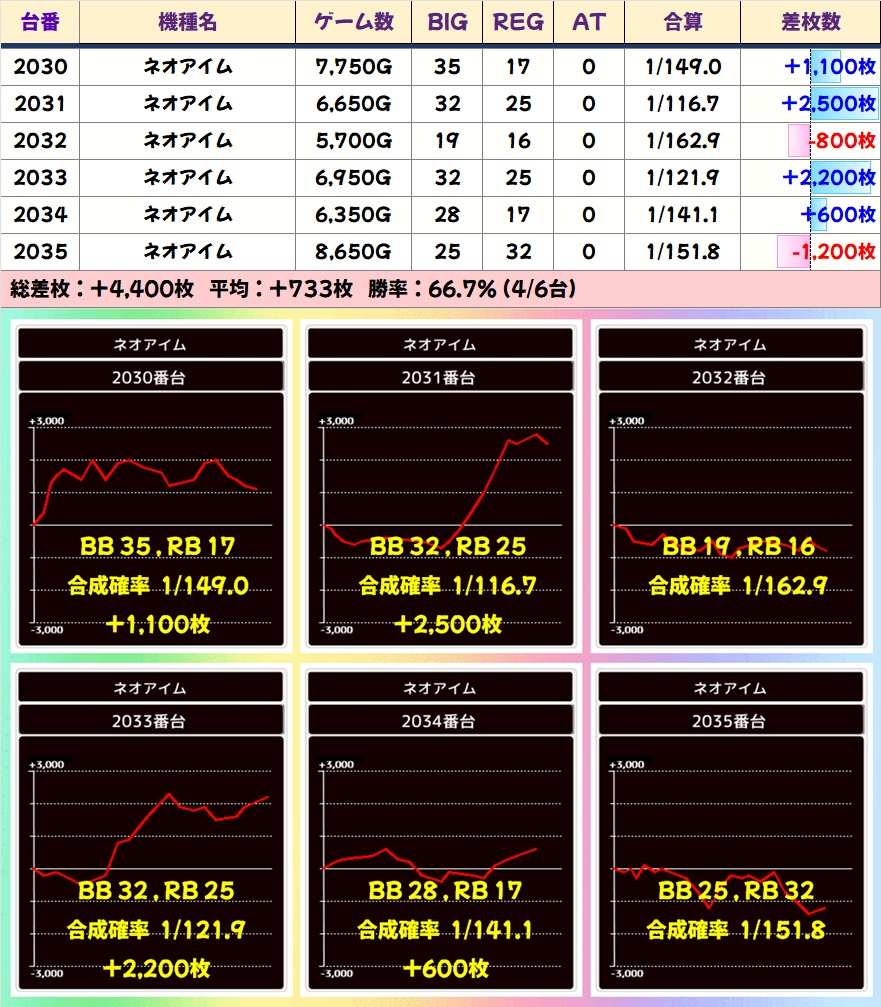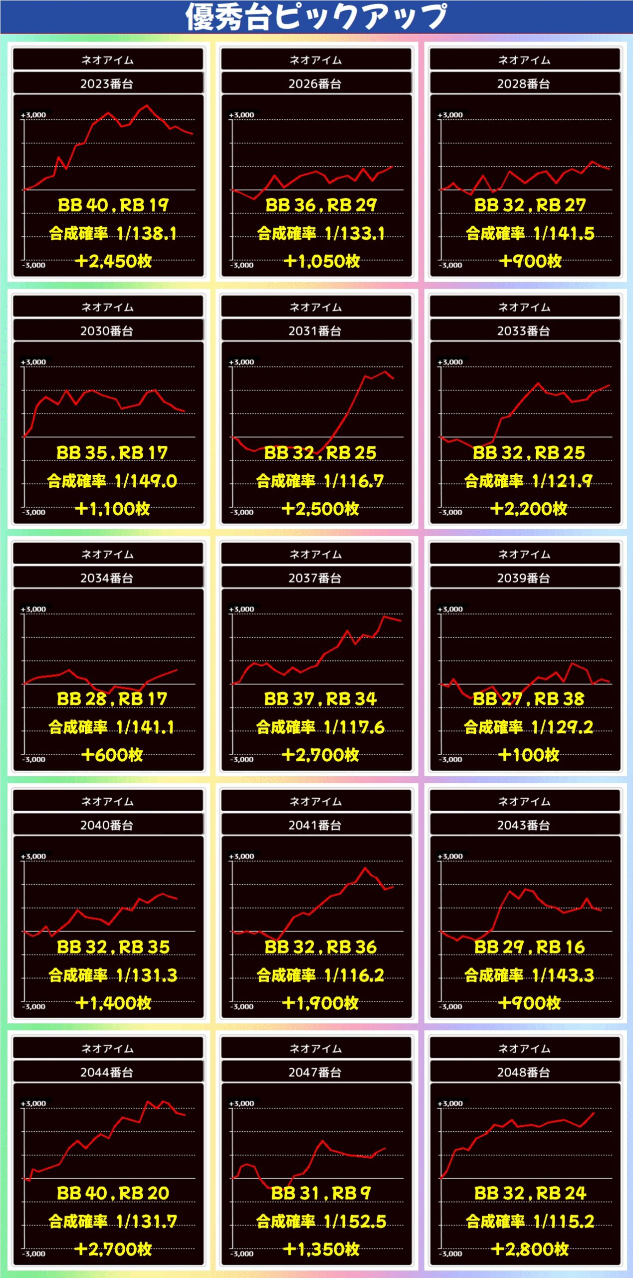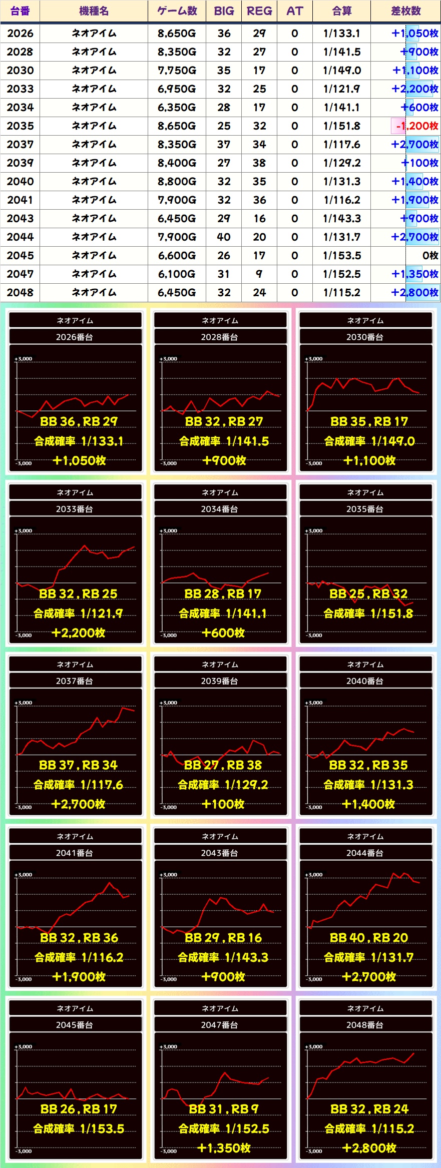 塊と思われる箇所は2030~2035番台、2039~2041番台、2043~2045番台の3箇所。どの台もしっかり回されており、合算良好台が多数出現しました。前日からの上げと思われる台は16台と多く、大半がプラス差枚でフィニッシュ。前日からの据え置きと思われる2026・2031番台はどちらも大幅なプラス差枚でしっかり出ていました。