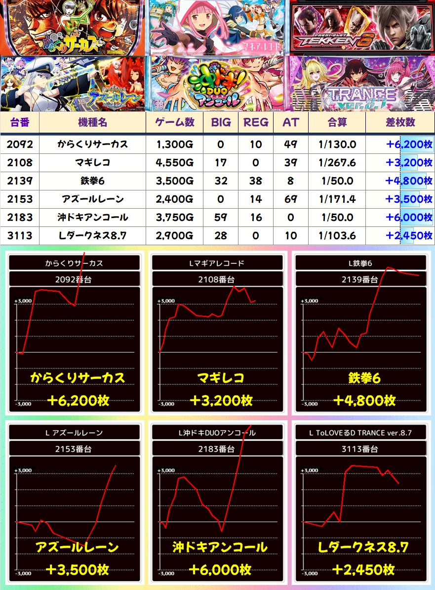 上記でまとめた仕掛け箇所以外にも+2,000枚オーバーの優秀台が続出。からくりサーカス・沖ドキアンコールからは+6,000枚オーバー台が出現したりと、幅広くお宝が投入されていた様子が窺えます。