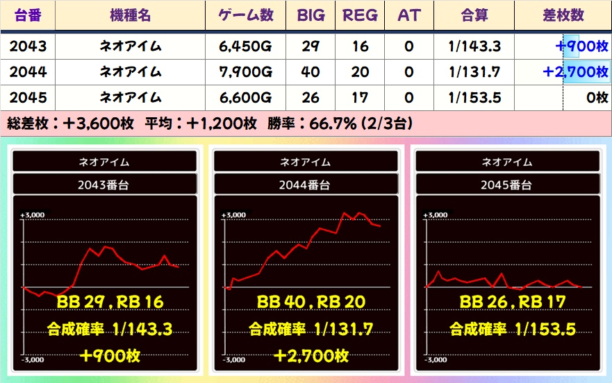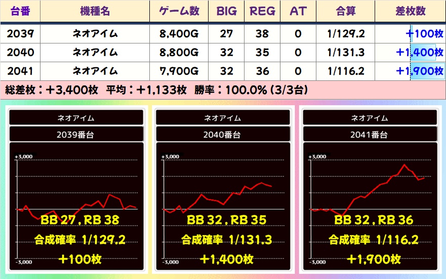 今回は全台系濃厚機種を2機種確認。Lゴッドイーターは全台プラスで平均+2.100枚という好成績、ハピジャグは1台惜しくもプラス域に届かなかったものの平均+1,000枚オーバーと優秀でした。3~5台設置機種が全台系になりやすいという特徴もあるので、次回以降も積極的に狙っていきましょう!