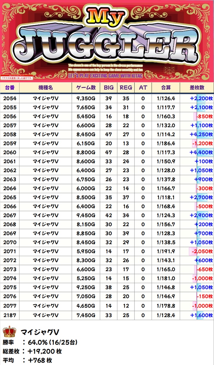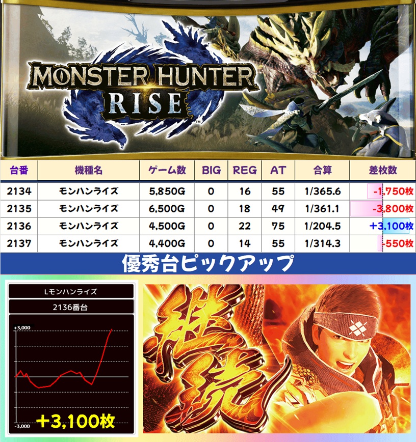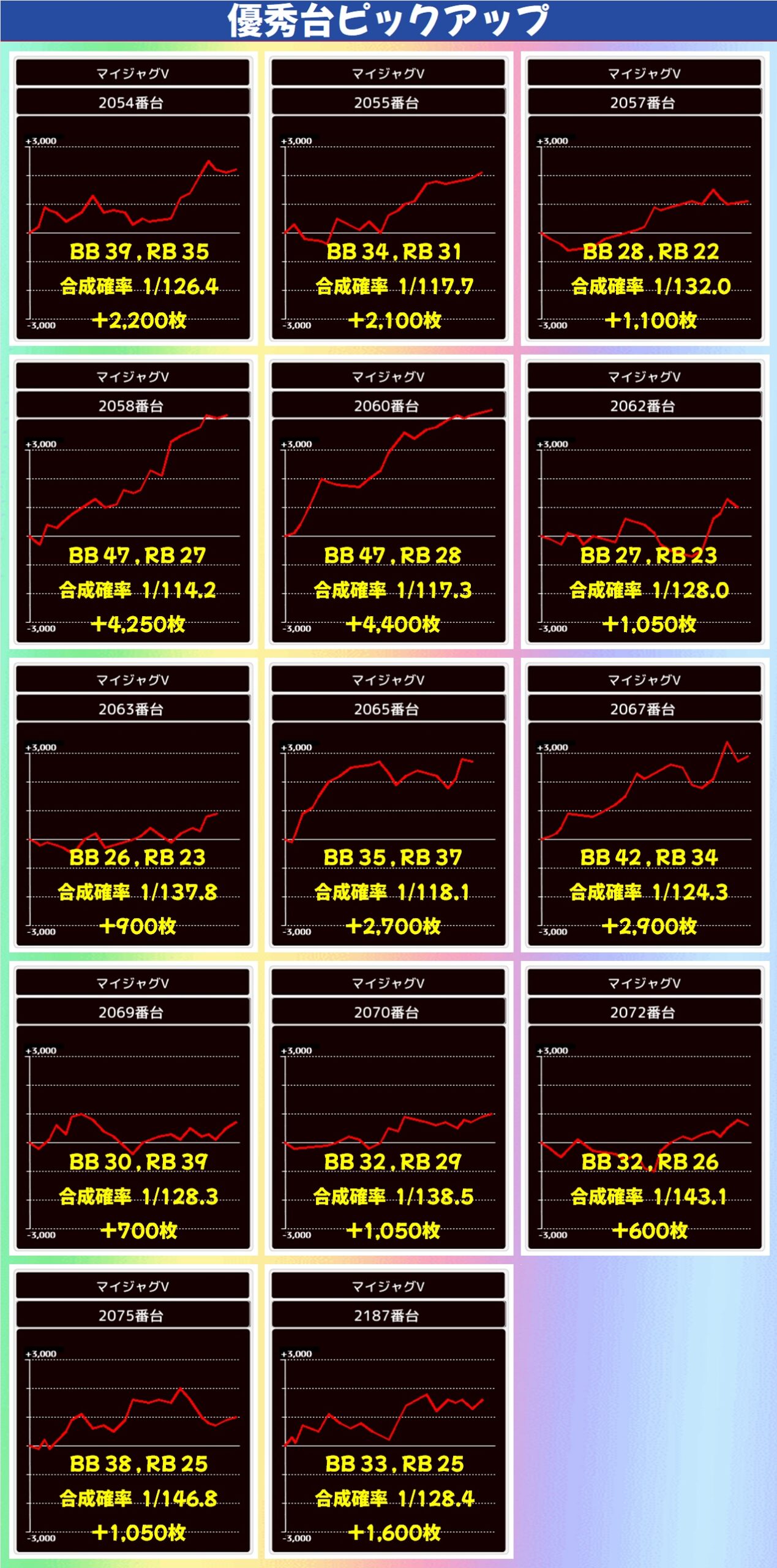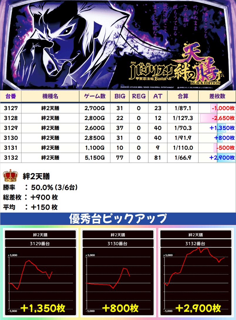 この日も総差枚+5万枚オーバー、台平均+182枚という好成績をマーク。傾向通り全台系濃厚機種がしっかり用意されていたほか、1/2系&高配分以上濃厚の優秀機種も大量に出現しました。