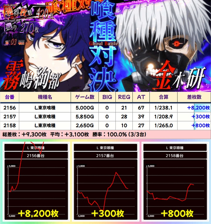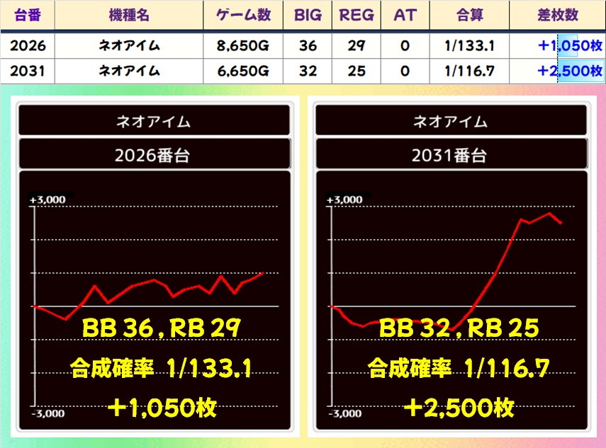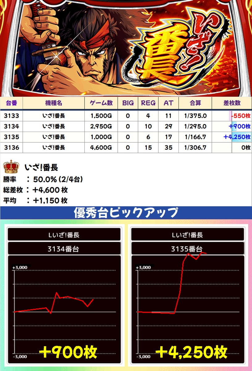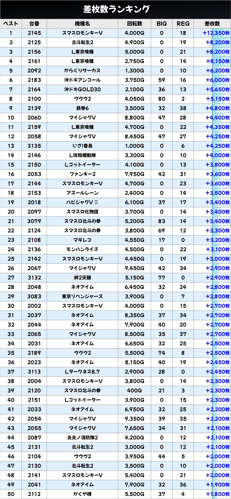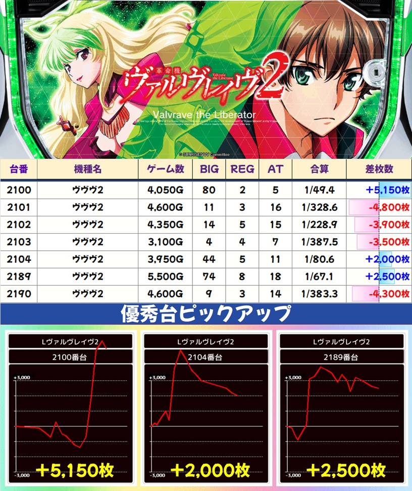 この日も総差枚+5万枚オーバー、台平均+182枚という好成績をマーク。傾向通り全台系濃厚機種がしっかり用意されていたほか、1/2系&高配分以上濃厚の優秀機種も大量に出現しました。