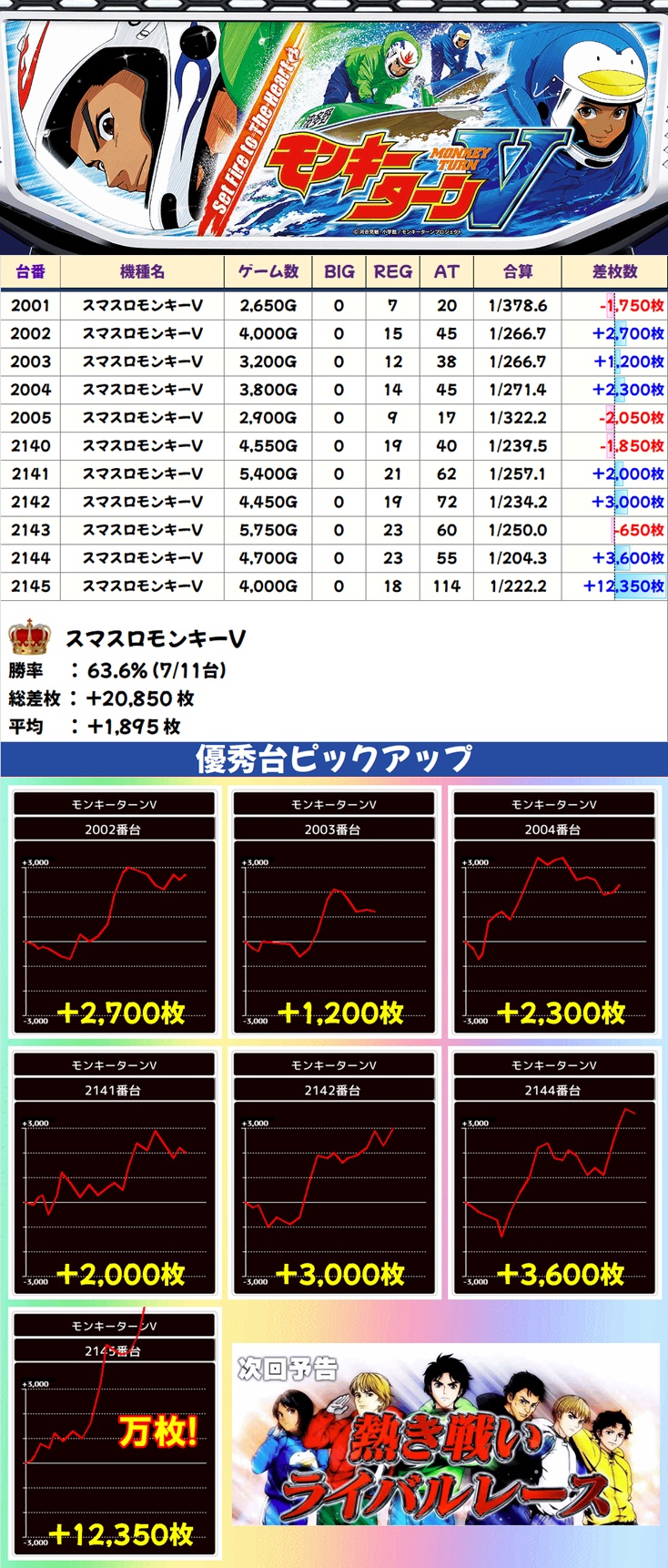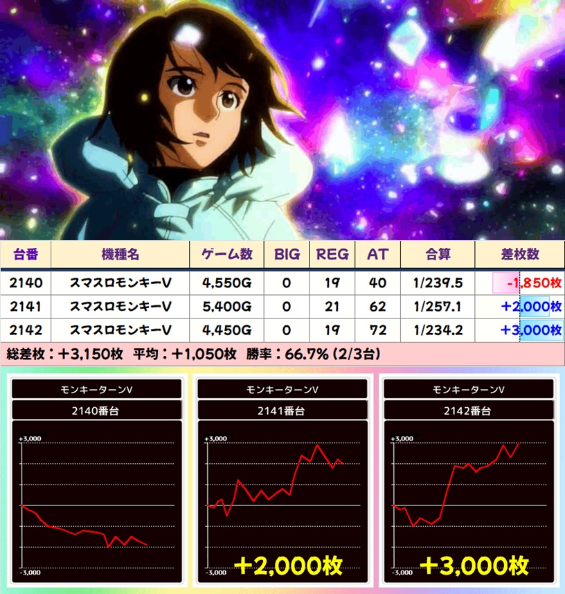 今回は3台並びと思われる塊仕掛けも多数見受けられました。なかでもモンキーVは3箇所に優秀並びが確認でき、それぞれの平均差枚も大幅なプラスに。機種跨ぎで出ていた箇所もあったりと、至るところにチャンスが散りばめられていました。