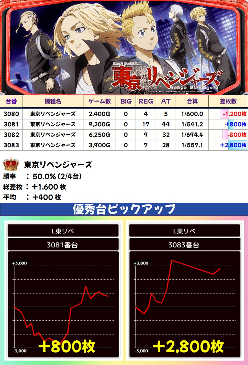 東京リベンジャーズ(2/4台+)➡平均+400枚