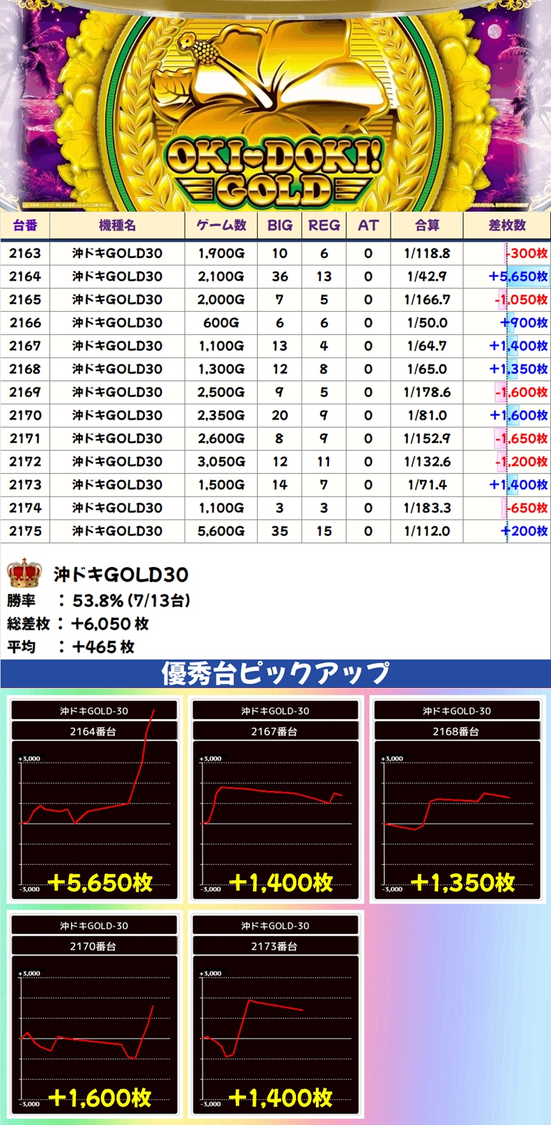 沖ドキGOLD30(7/13台+)➡平均+465枚