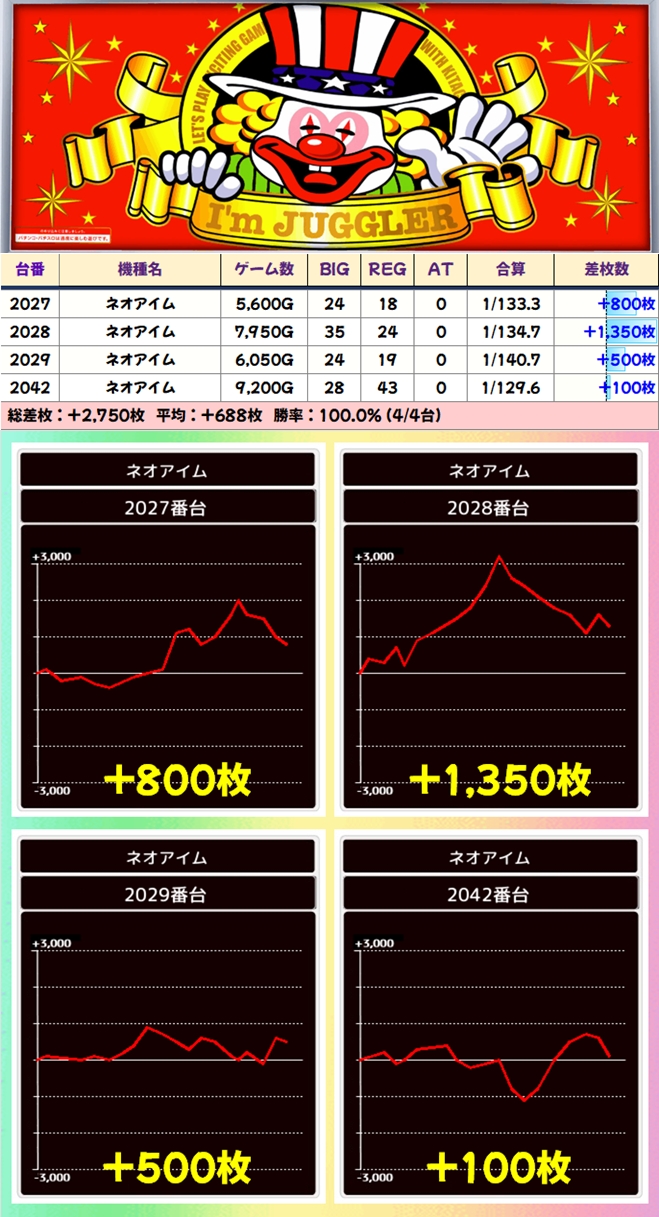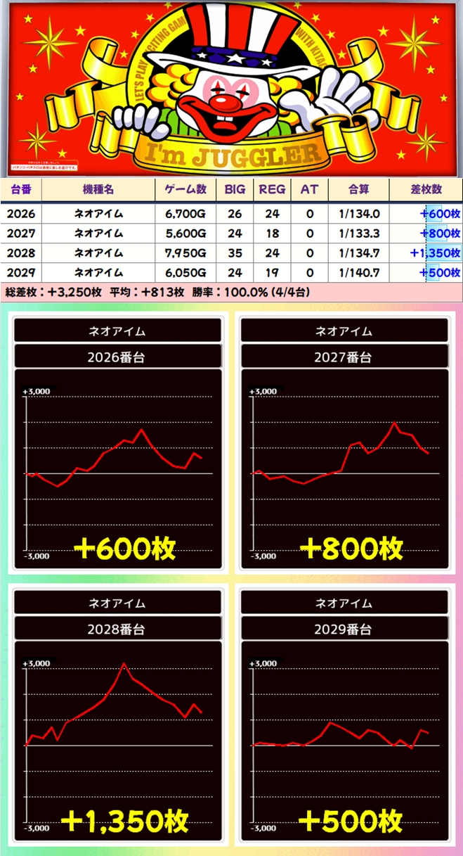 4台並びは2026-2029番台に仕掛けられ、上げや据え仕掛けとも重複!ネオアイムはこれらの仕掛けがおなじみなので特日で狙う際は前日の挙動も要チェック!