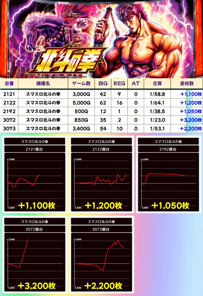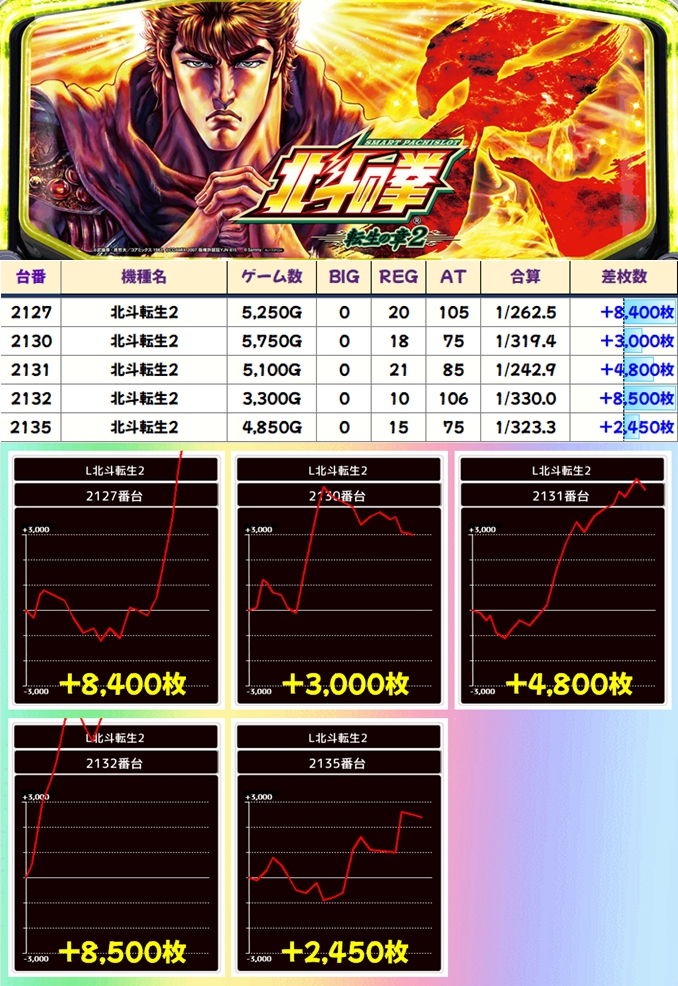 7の日ということもあってか北斗シリーズも優秀結果に!転生2からは8000枚超が複数、スマスロ北斗からも1000枚超が複数確認できました!