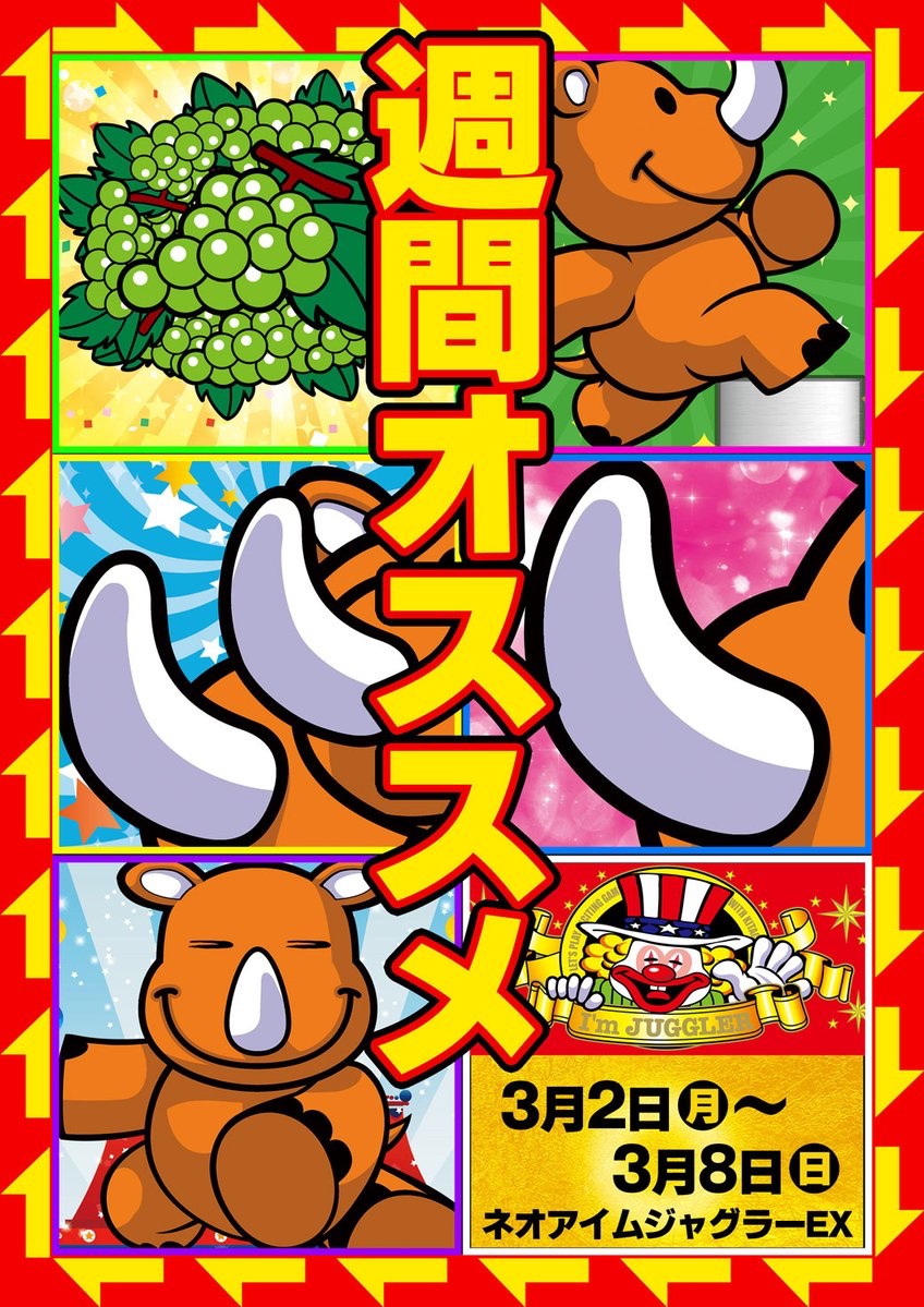 週間オススメ機種のネオアイムに関してはポスターのイラストに秘密があり、毎日イラストに応じたいずれかの仕掛けが用意されているようです。イラスト対応の仕掛け内容は下記の通り。