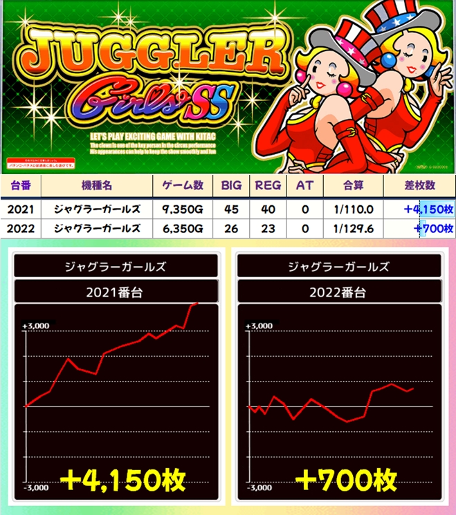 ジャグラーガールズ(2/4台+)➡平均+625枚