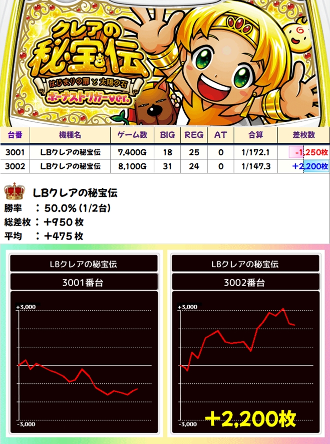 クレアの秘宝伝(1/2台+)➡平均+475枚