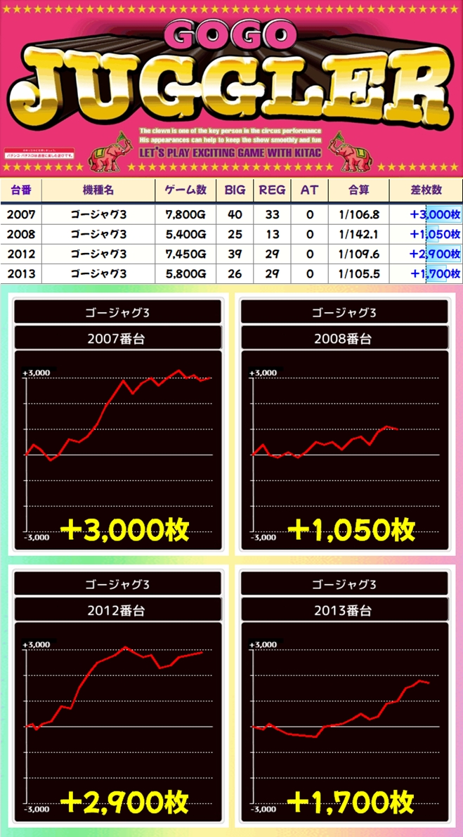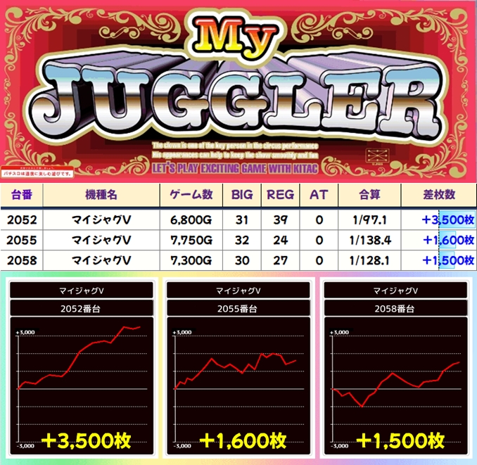 ジャグは高配分シリーズが3機種あり!いずれも平均500枚以上のプラスで各機種から1000枚超の優秀台も確認できました!
