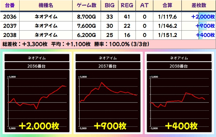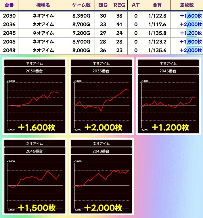 過去の傾向では必ず全台系濃厚機種があることに加え、1/2系濃厚機種や高配分の優秀機種も多数出現しており、数多くの機種にチャンスがあります。またネオアイムには並びや上げ、据え狙いが可能な台もあることにも注目です!