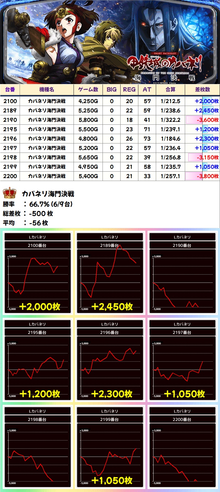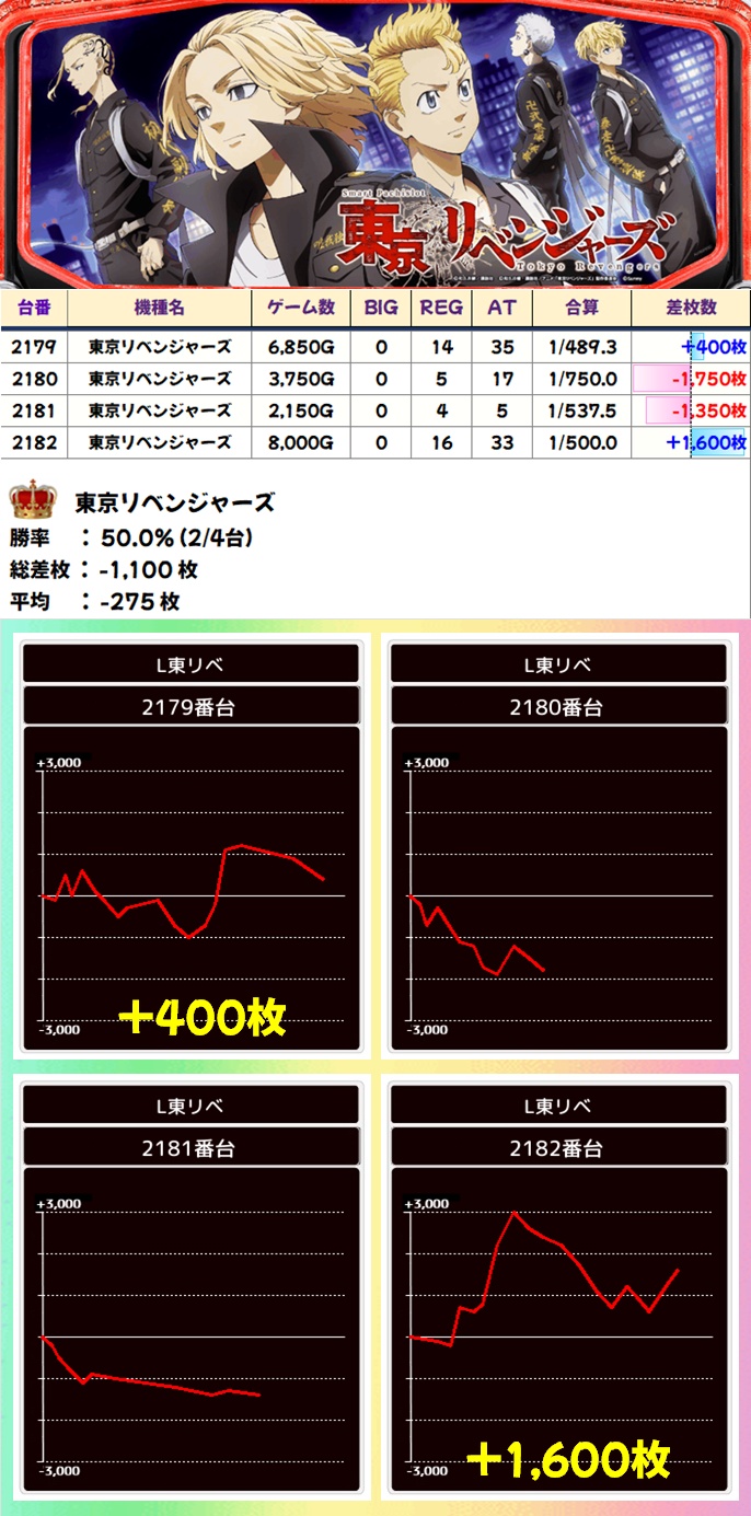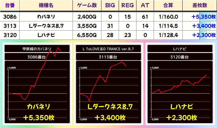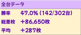 総差枚+8万枚オーバー、台平均+287枚で連勝記録を継続。傾向通り全台系濃厚機種がしっかり用意されていたほか、1/2系&高配分以上濃厚の優秀機種も大量に出現しました。