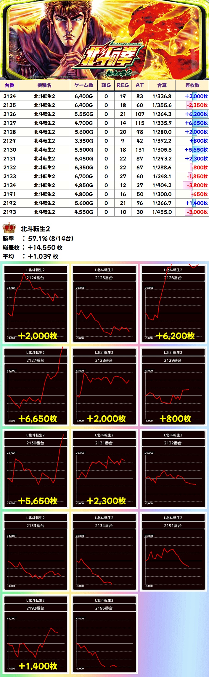 北斗転生2(8/14台+)➡平均+1039枚