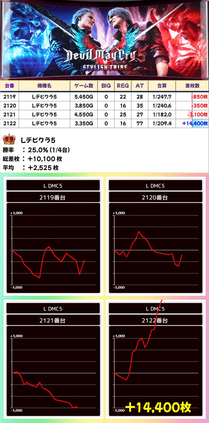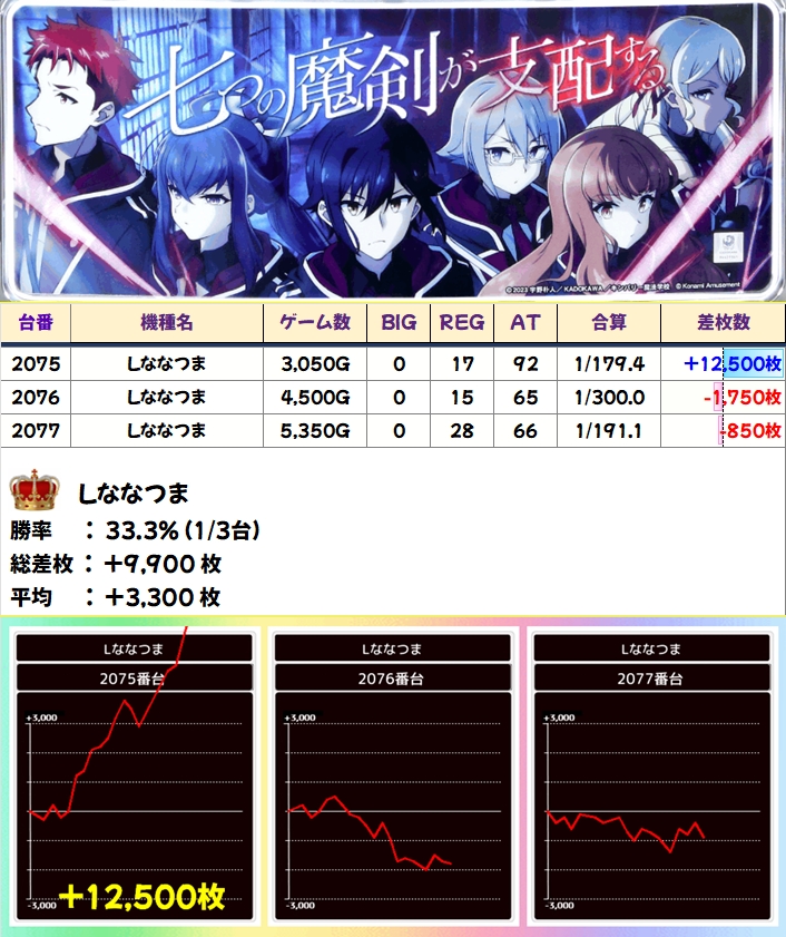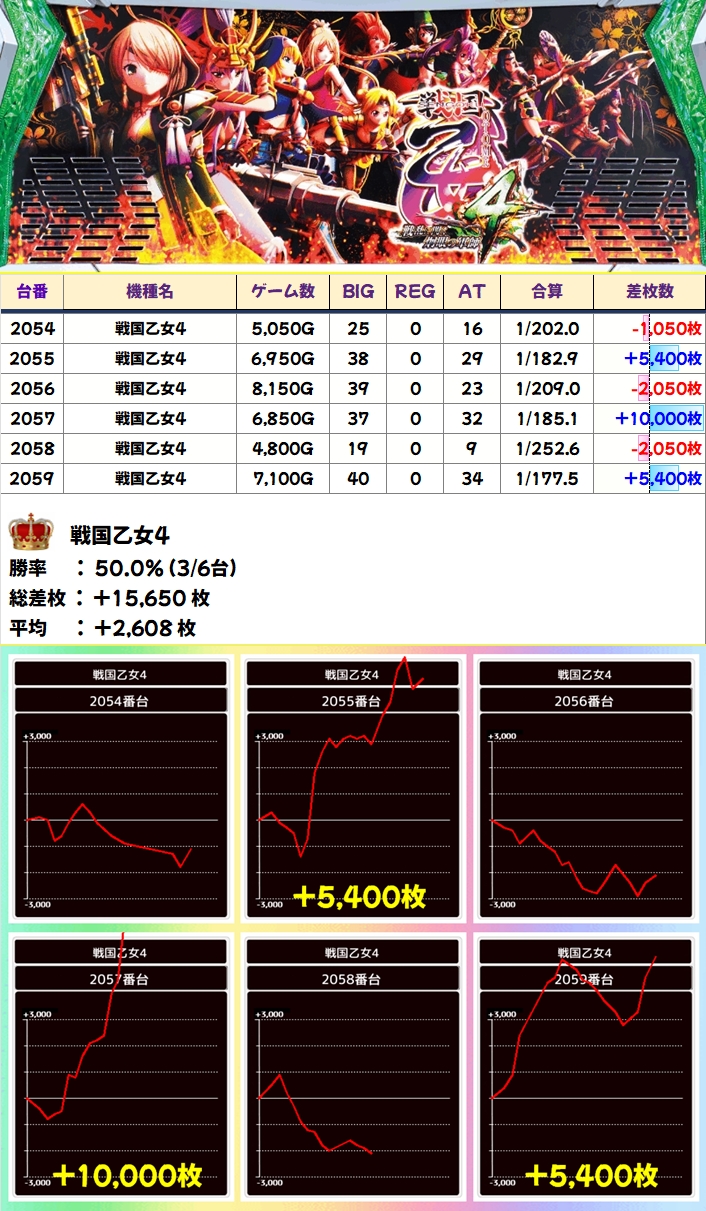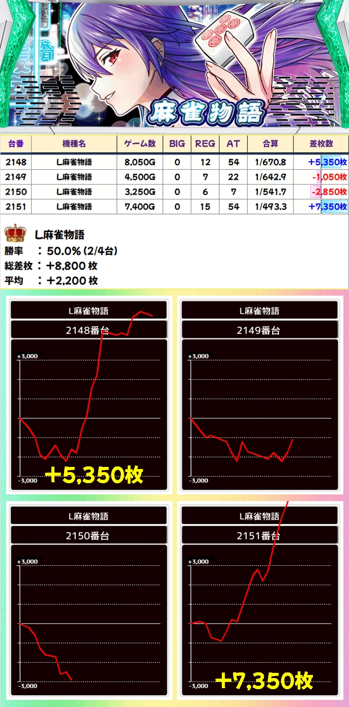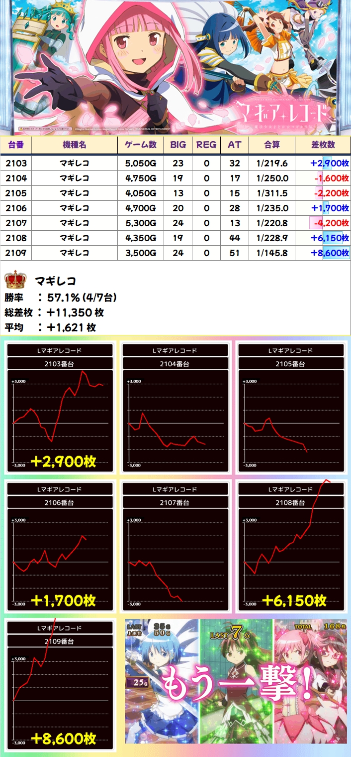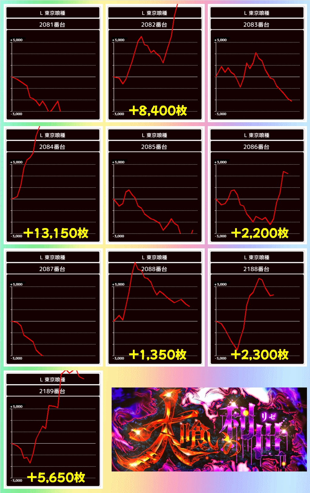 戦国乙女4やDMC5、東京喰種・ななつまなどから万枚超があり、各機種に高品質台が仕掛けられていたように感じます。1/2系と思わしき機種は人気スマスロに集中していました!