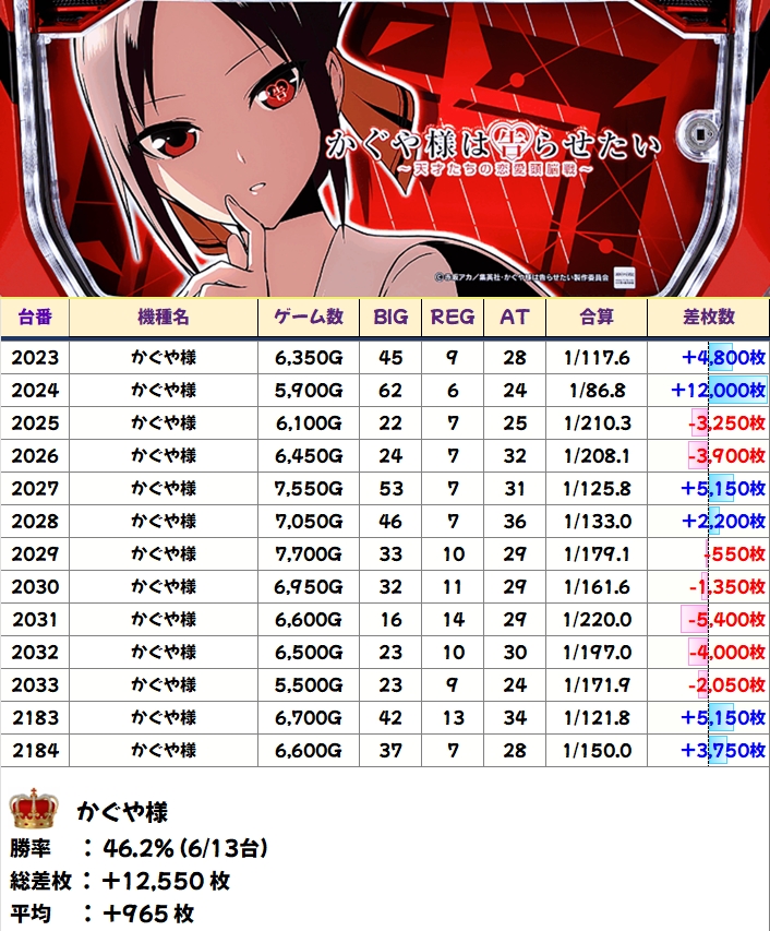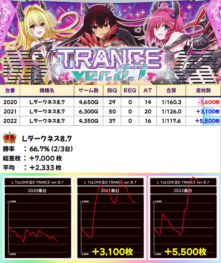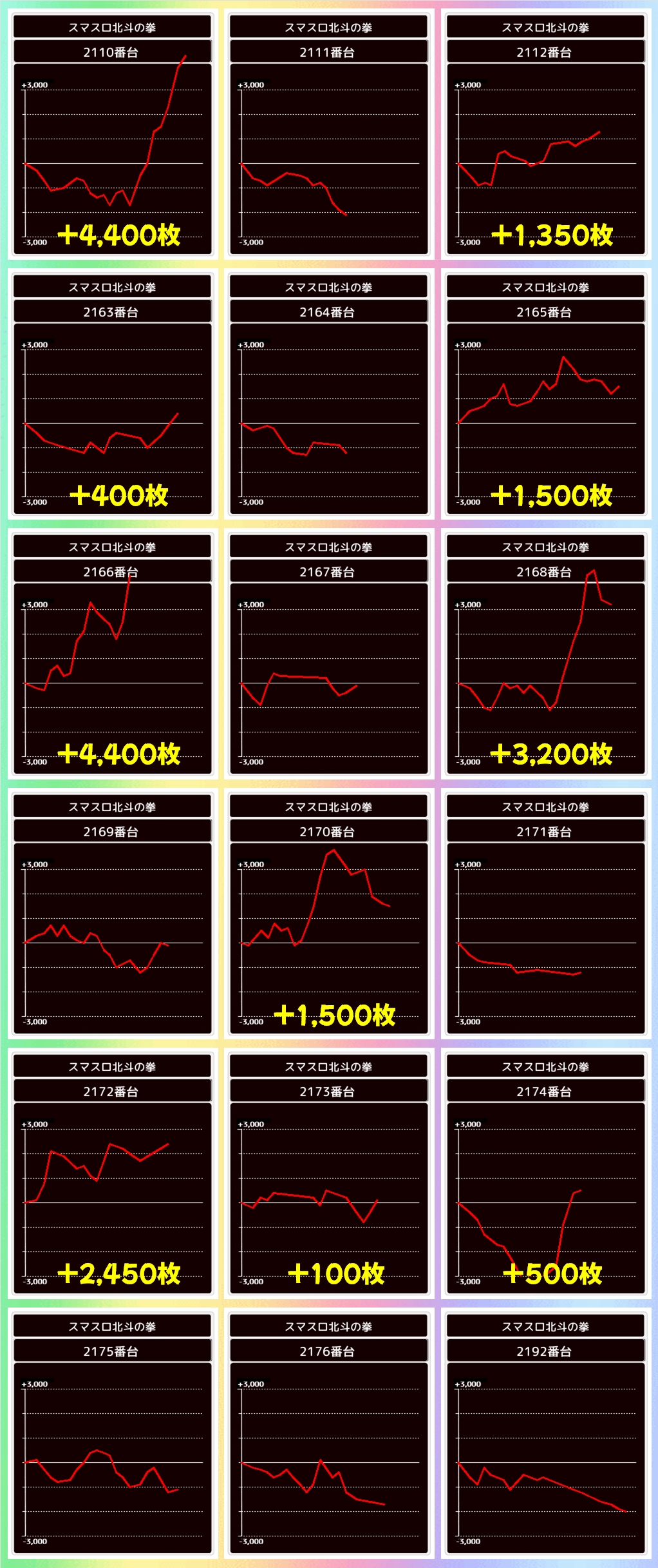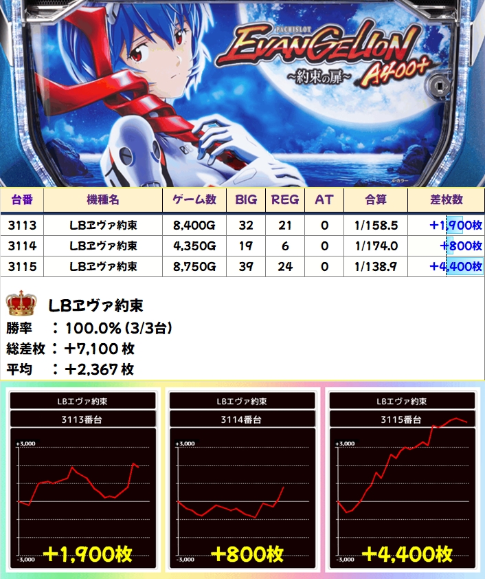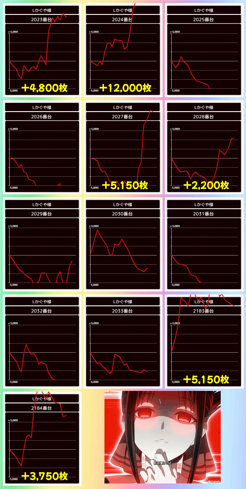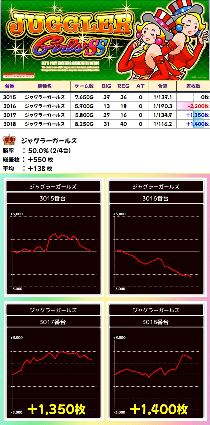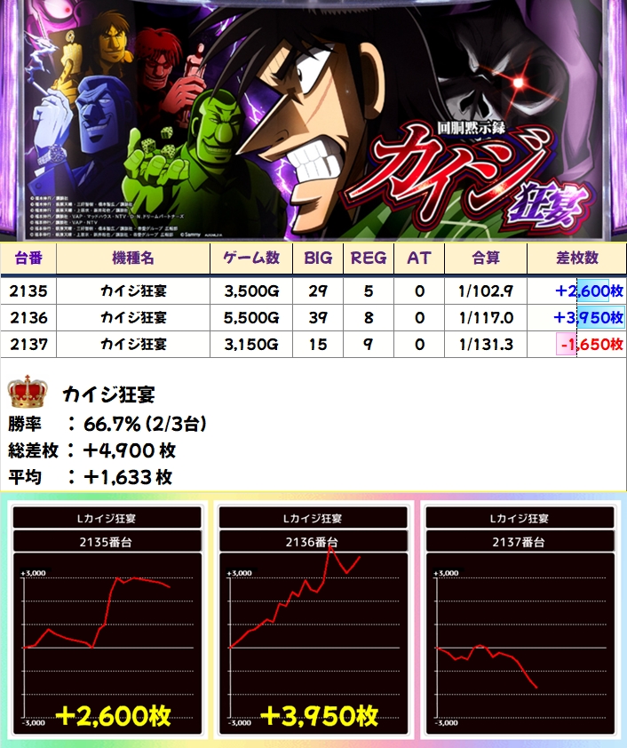 戦国乙女4やDMC5、東京喰種・ななつまなどから万枚超があり、各機種に高品質台が仕掛けられていたように感じます。1/2系と思わしき機種は人気スマスロに集中していました!