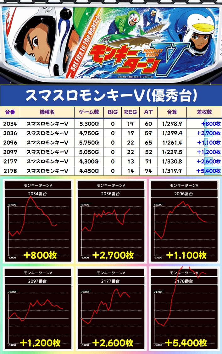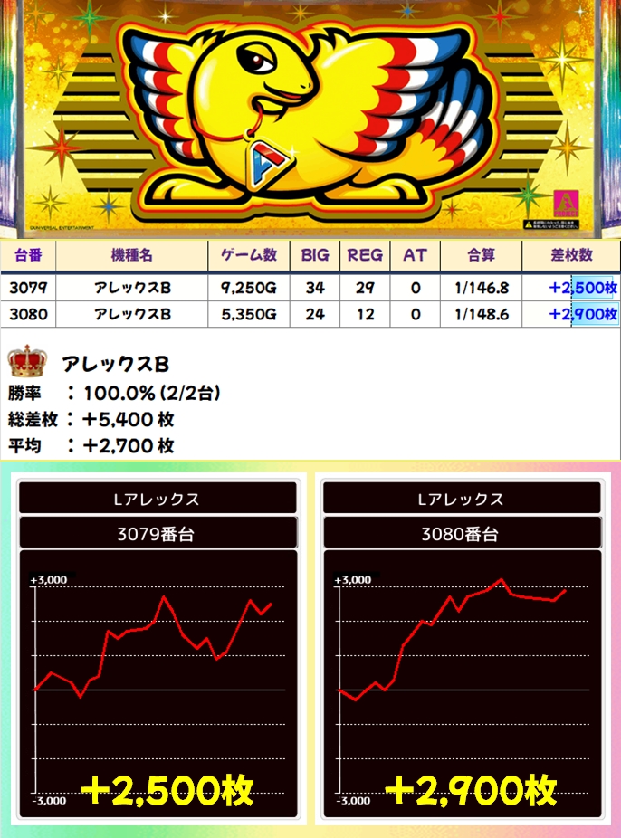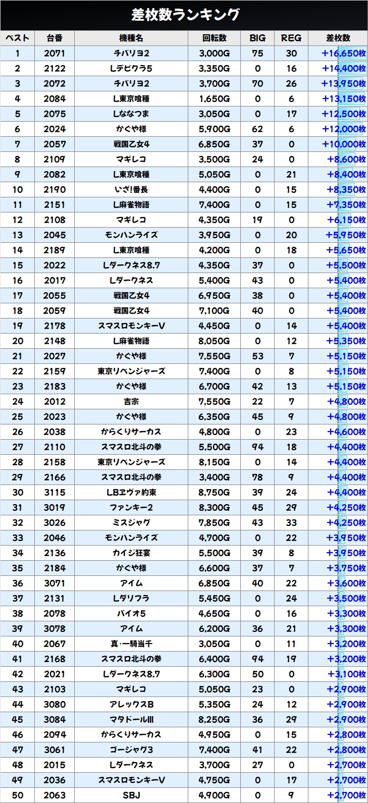 万枚台が7台、40台以上が+3000枚超となり、総差枚は11万枚を超える優秀結果に!仕掛けがあった機種のほとんどの機種が出玉ランキング上位にランクインし、仕掛け以外では新台系なども結果を残しました。