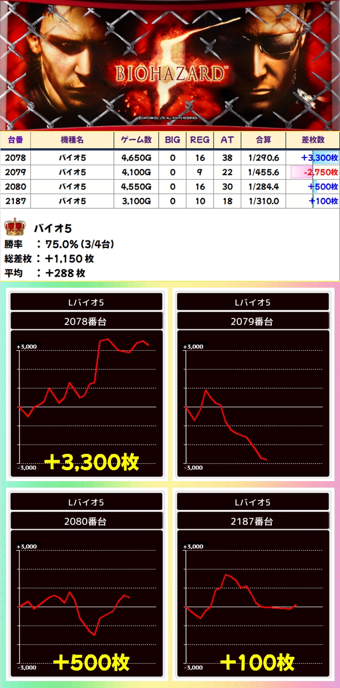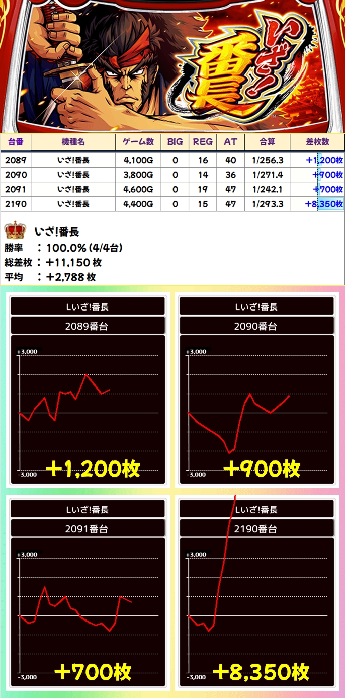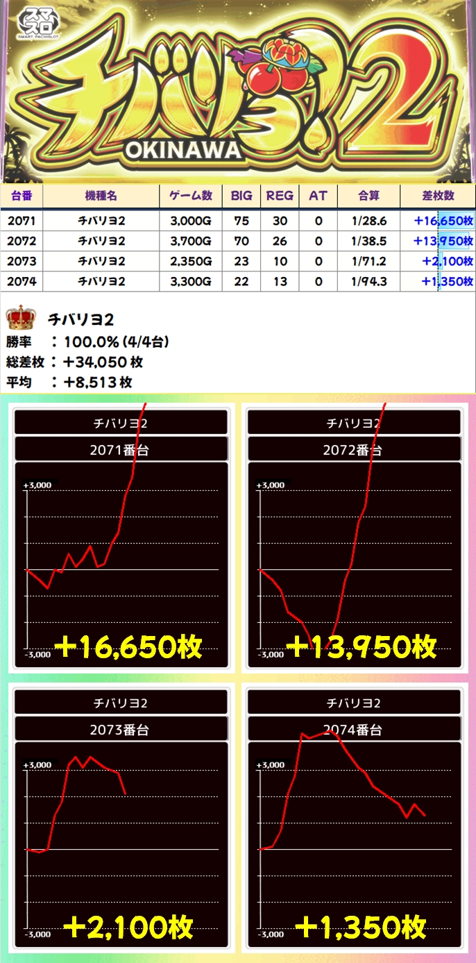 今回はチバリヨ2から万枚超が2台と頭一つ抜けて派手な結果になり、いざ番から8000枚超、ノーマルからは+2000枚超台を確認できました!