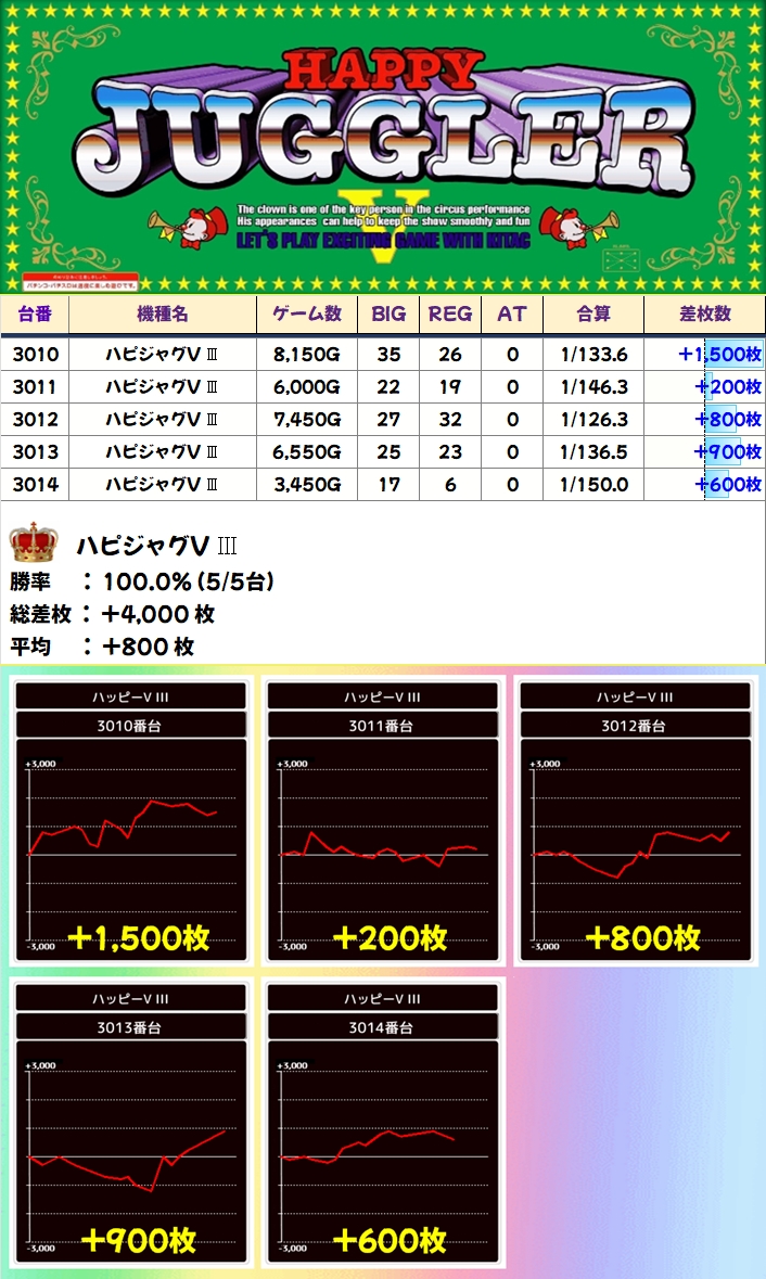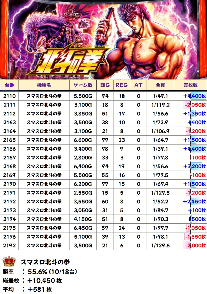 先月までは天下無双取材でしたが今回は格付け取材で結果は総差枚は11万枚オーバー!全体の100台以上が1000枚超となりました!