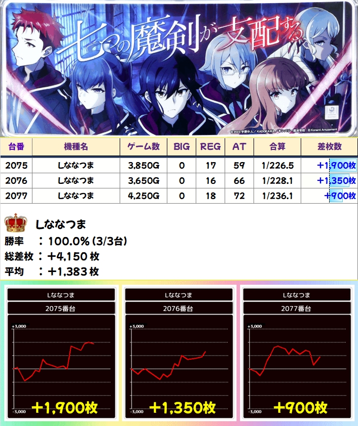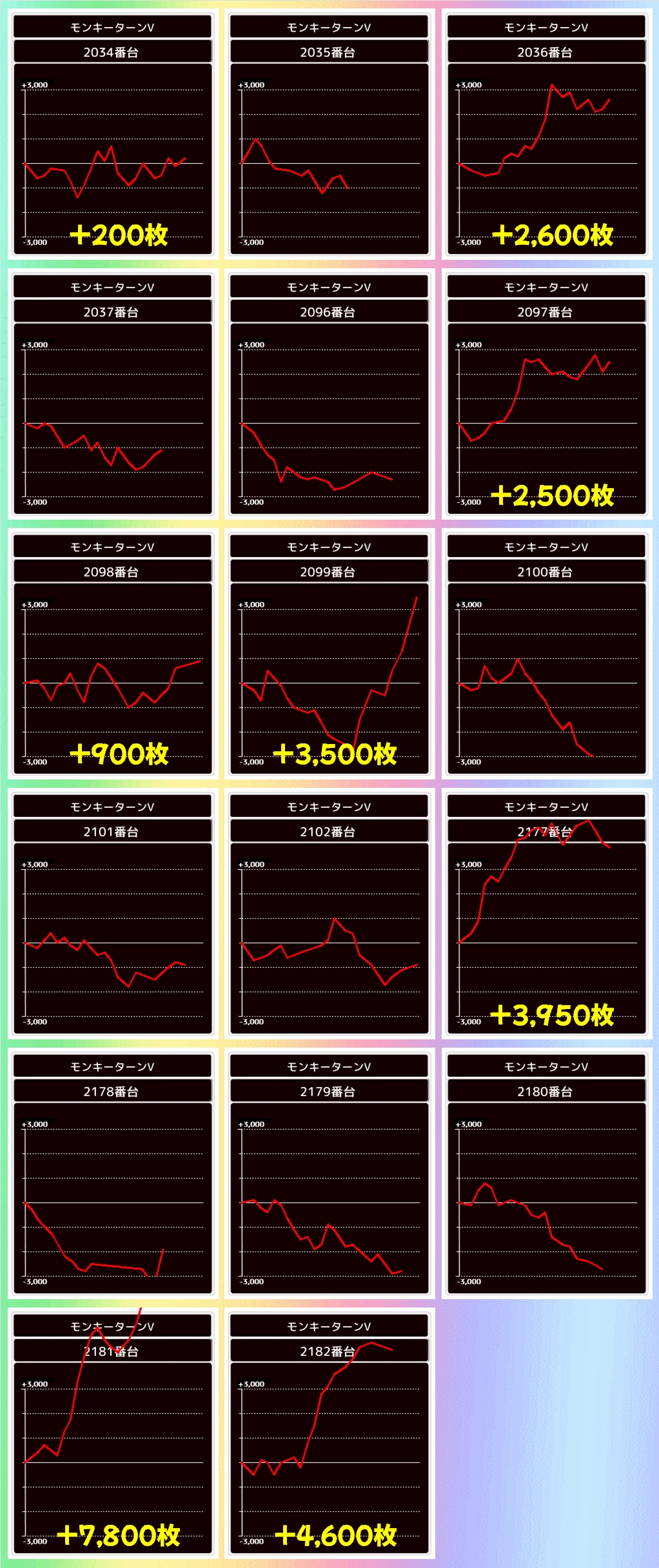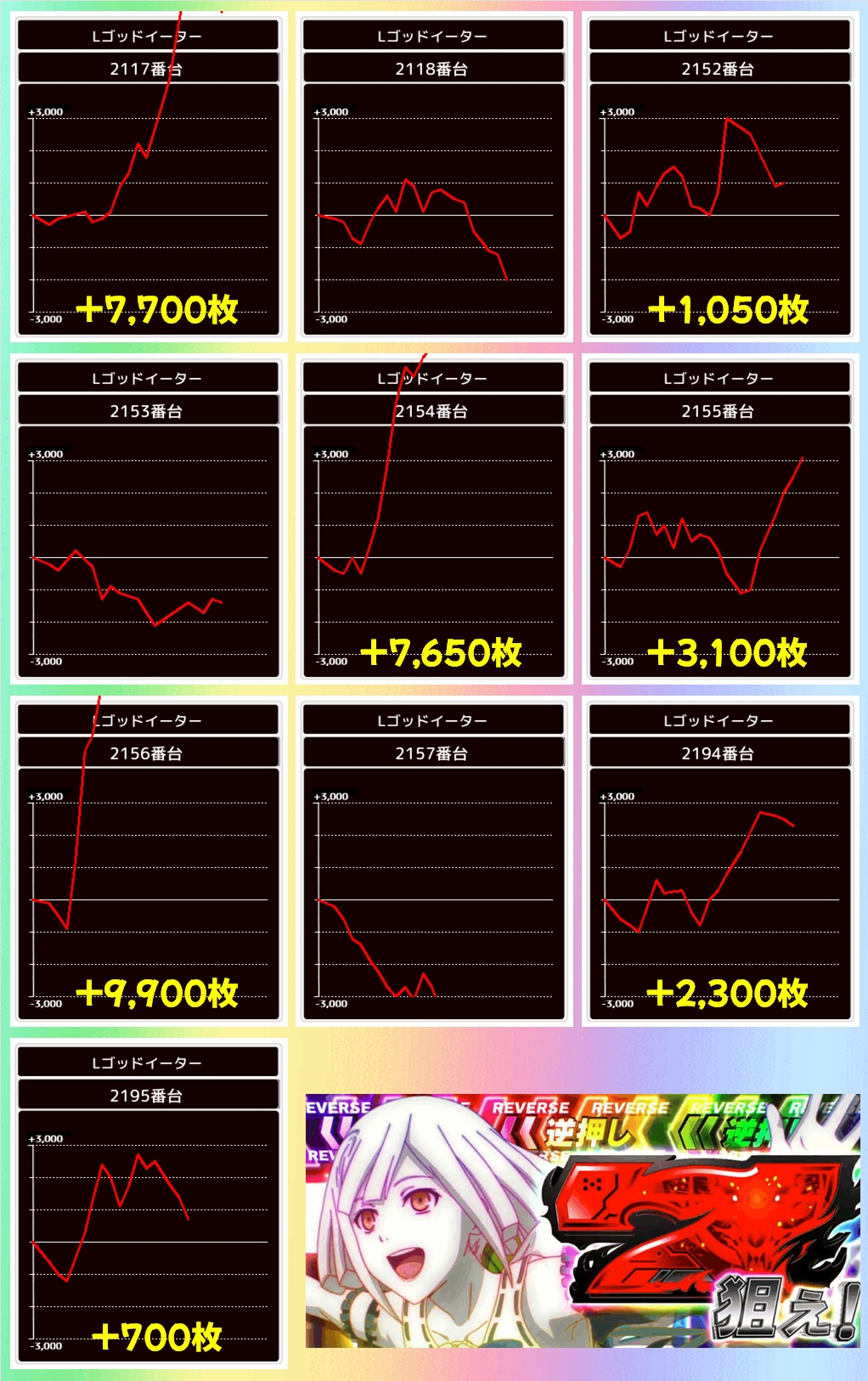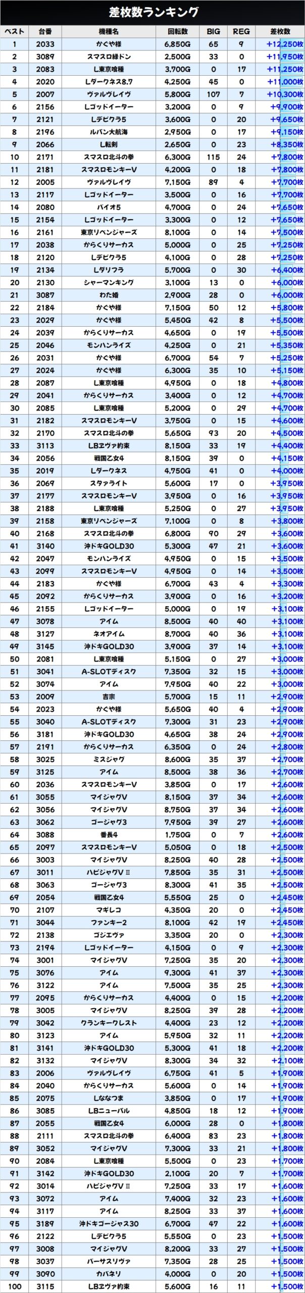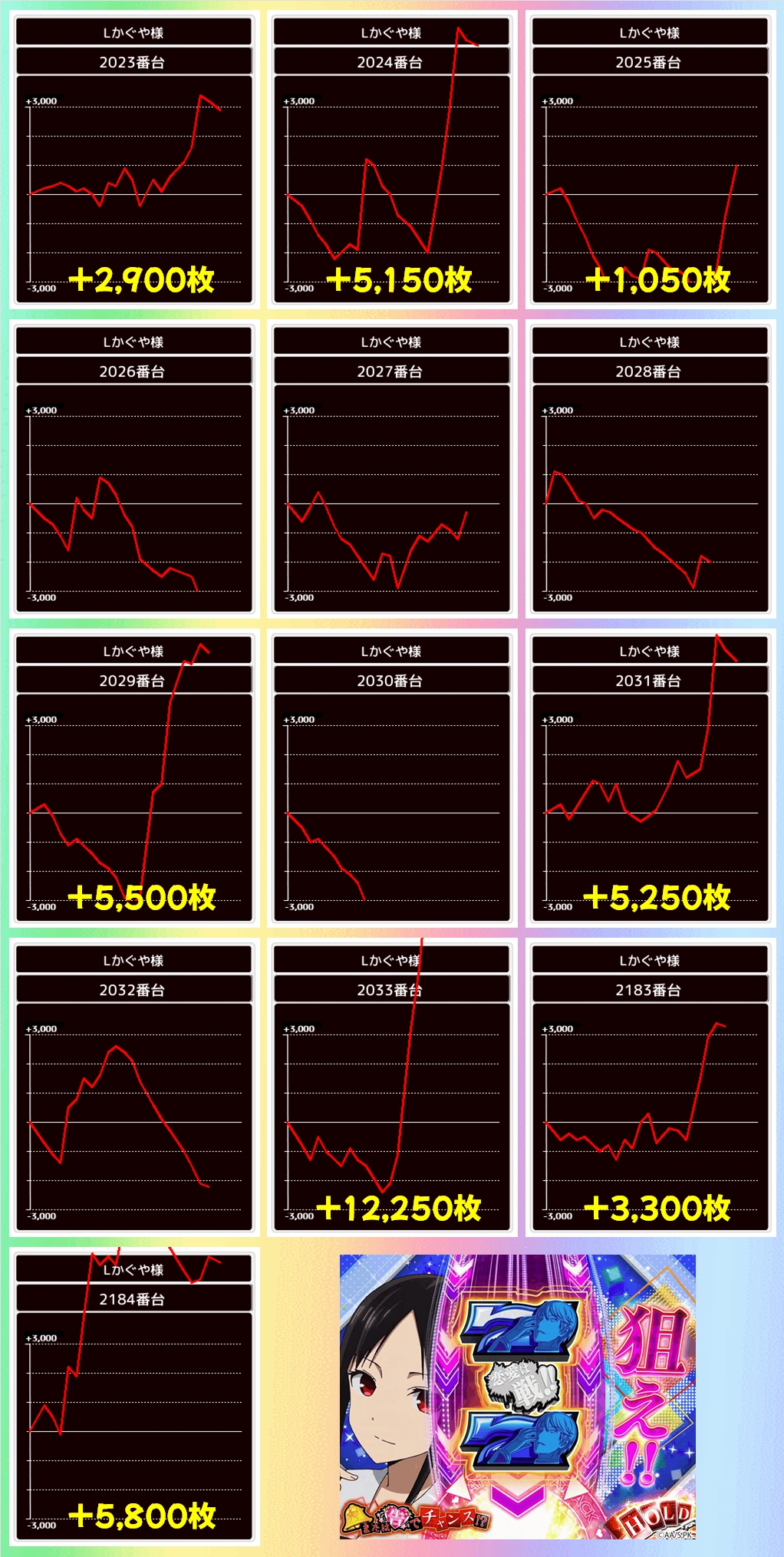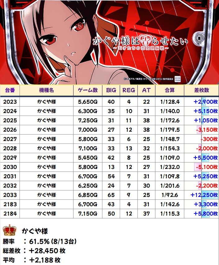 1/2系と思わしき機種は人気スマスロや毎日機種などが対象で、かぐや様やヴヴヴなどSANKYO系は万枚台も確認!マイナス台はあるものの、それらも回されているので周りの挙動が良かったり粘るべき要素が出現していた可能性あり!