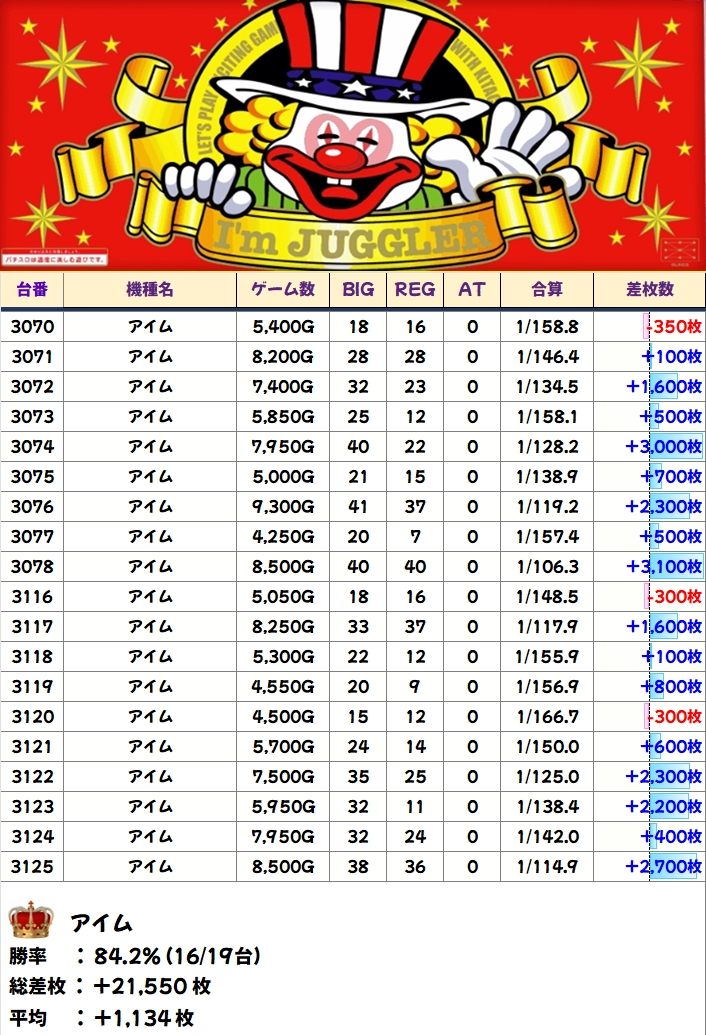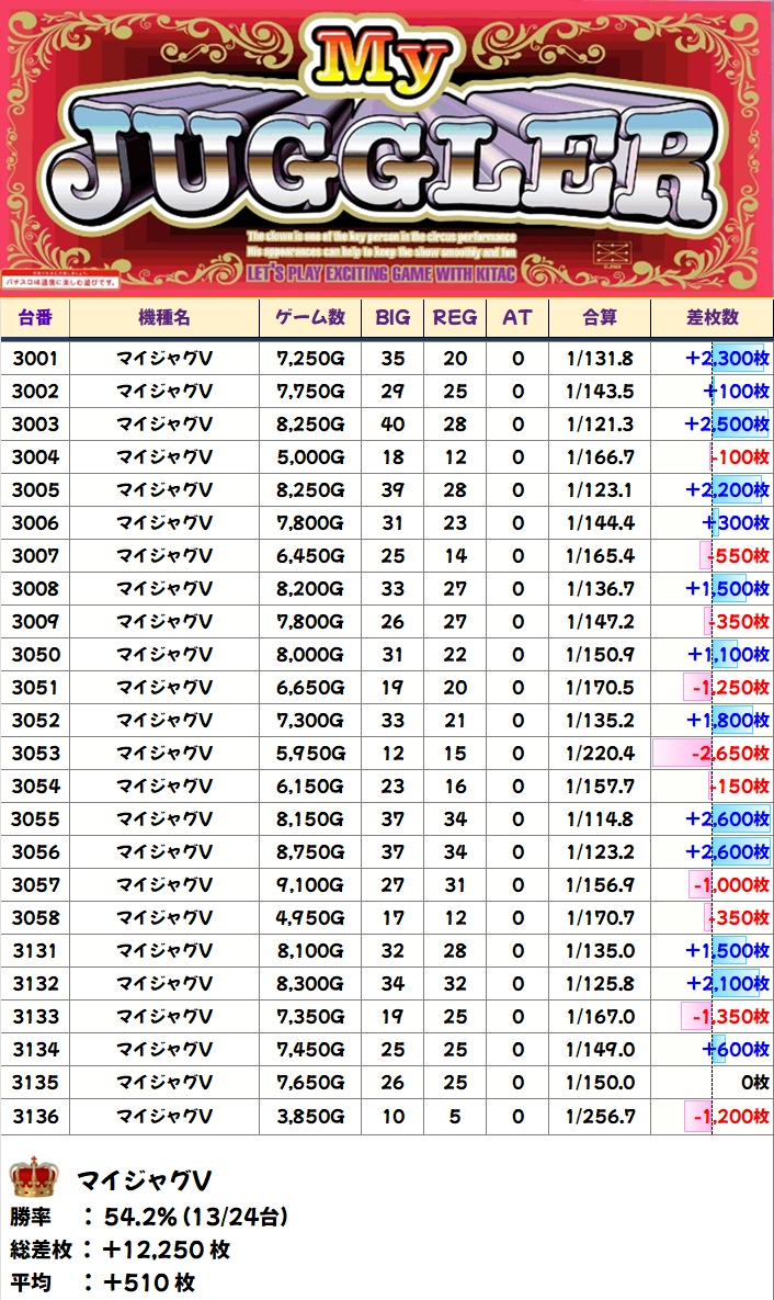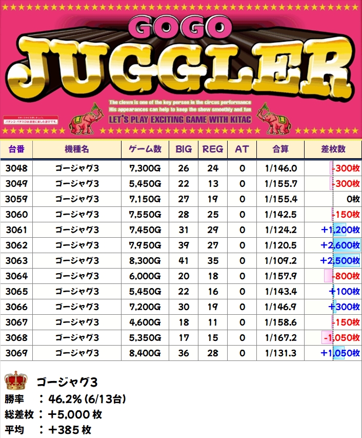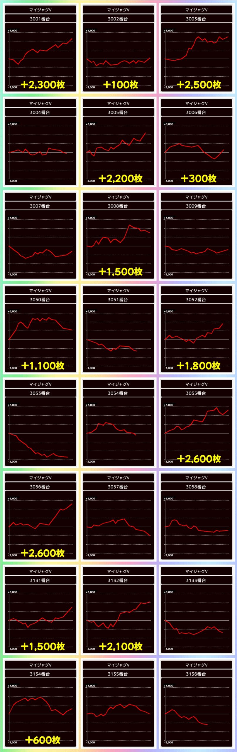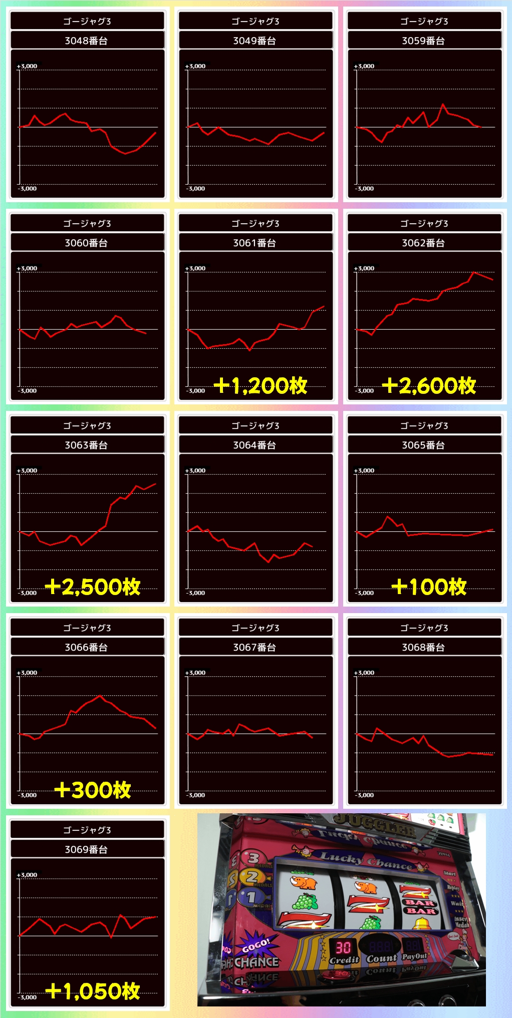 ジャグにも優秀シリーズがあり、どちらも高ベースだった可能性大!プラス台も多く5000G以上回されている台が多いので、打ち手はしっかりと看破したのでしょう。