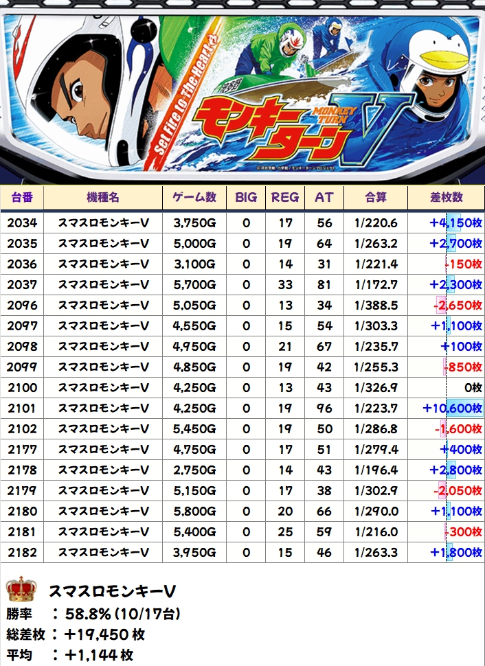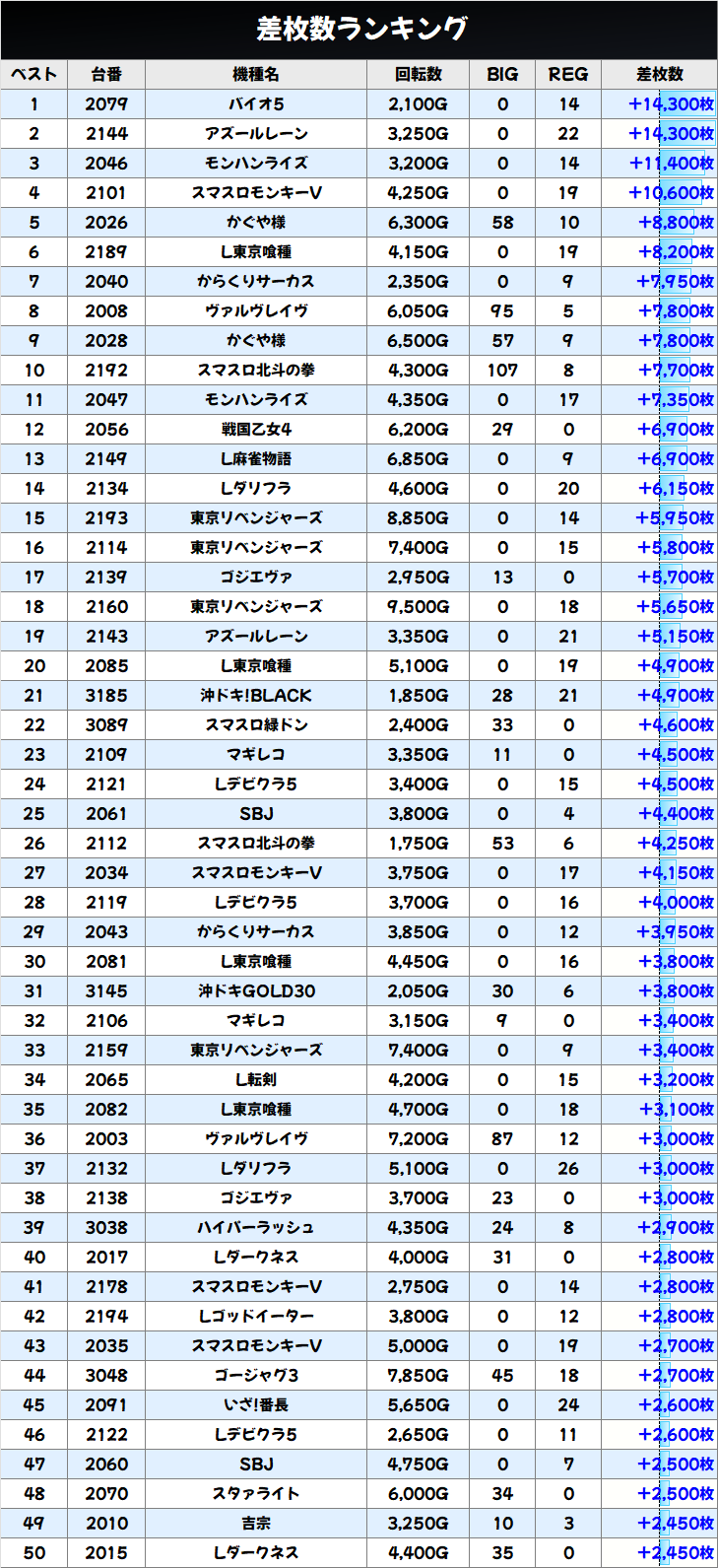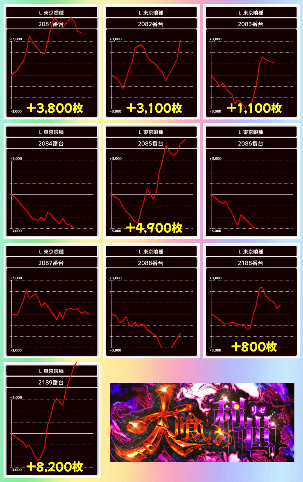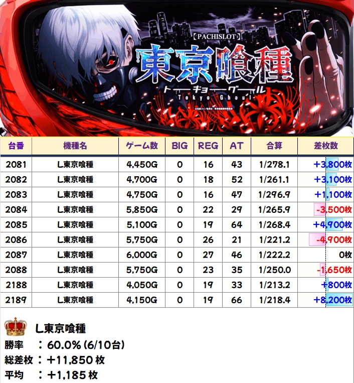 1/2系以上と思わしき機種が8機種と大量にあり!人気スマスロや新しめの台などが優秀になりました。各機種から+2000枚超の大量出玉がありますが、モンキーV&アズレンは万枚超、東京喰種からも+8000枚オーバーと頭一つ抜けた優秀台が出現!