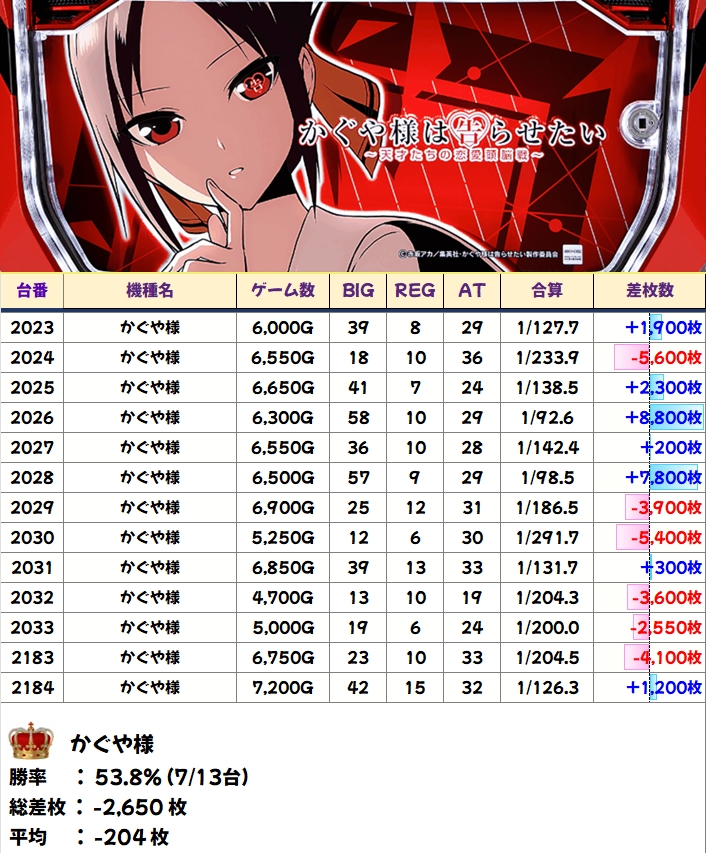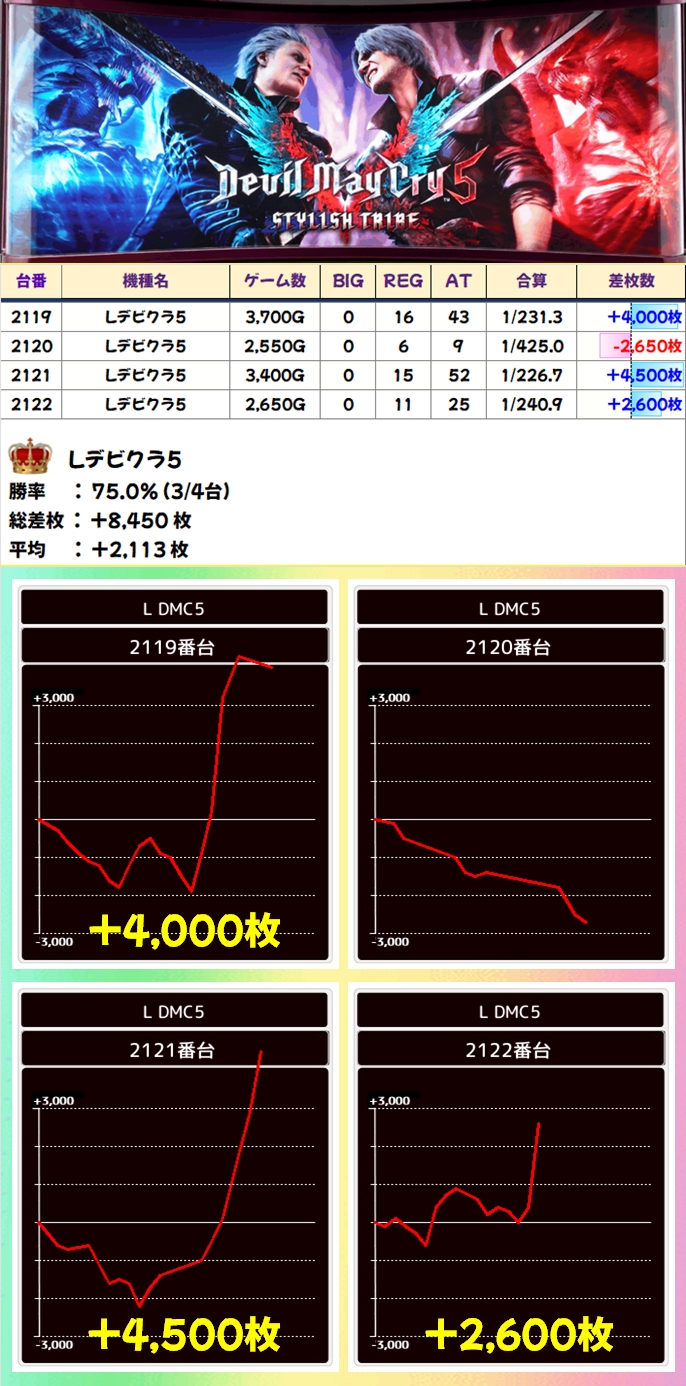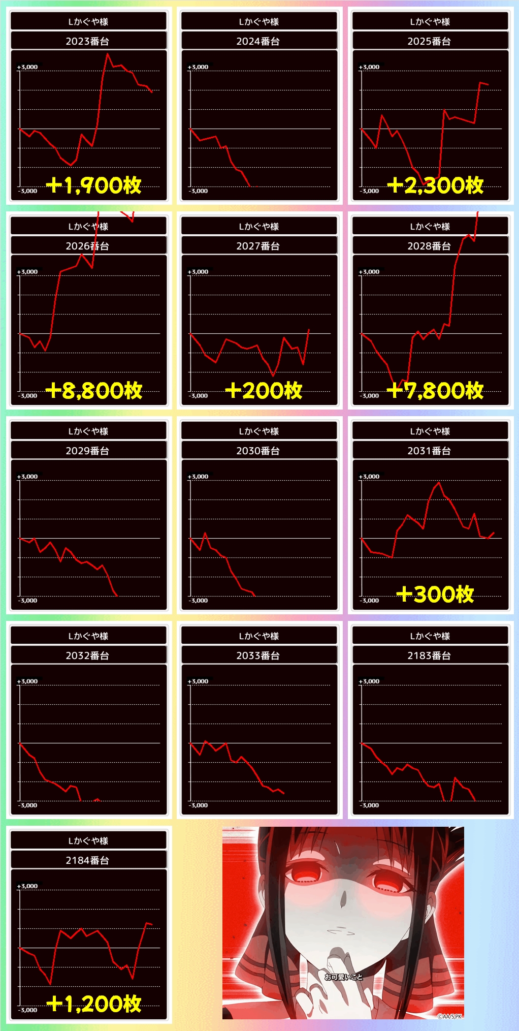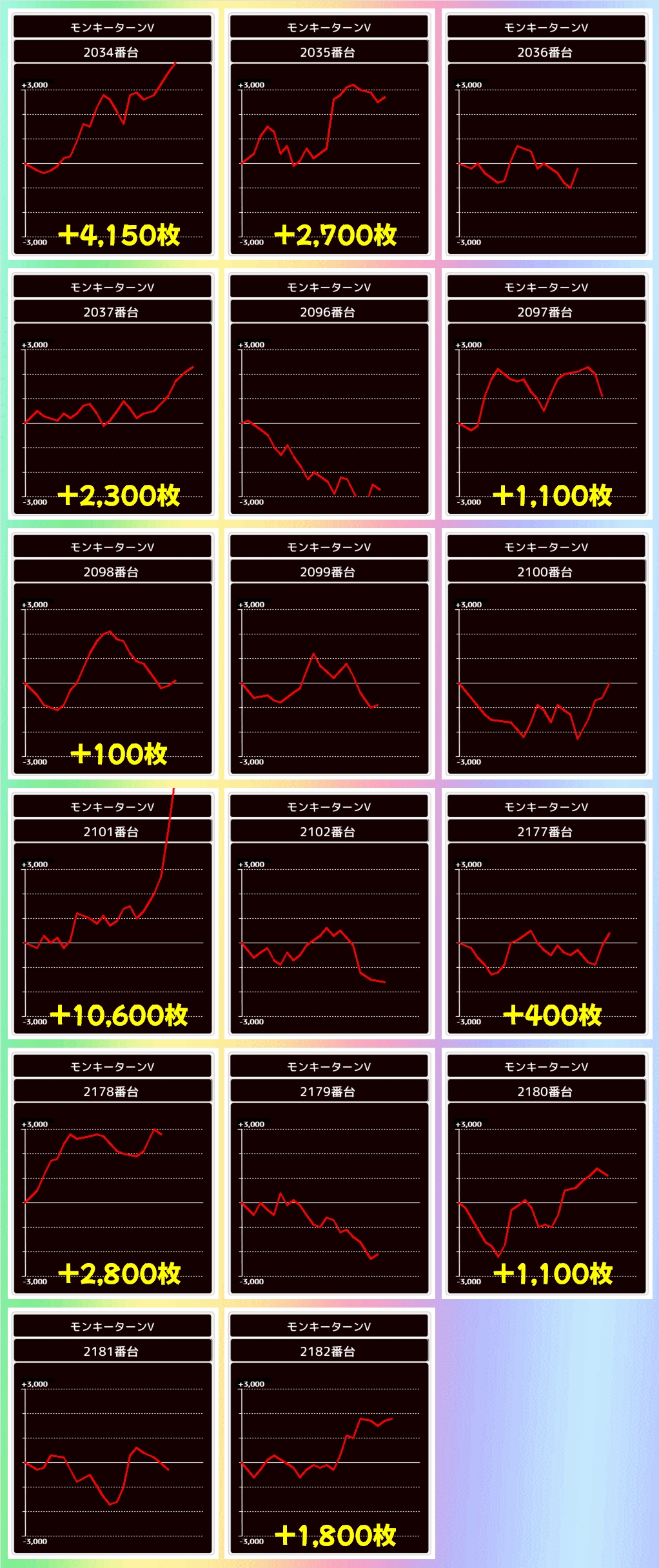 1/2系以上と思わしき機種が8機種と大量にあり!人気スマスロや新しめの台などが優秀になりました。各機種から+2000枚超の大量出玉がありますが、モンキーV&アズレンは万枚超、東京喰種からも+8000枚オーバーと頭一つ抜けた優秀台が出現!