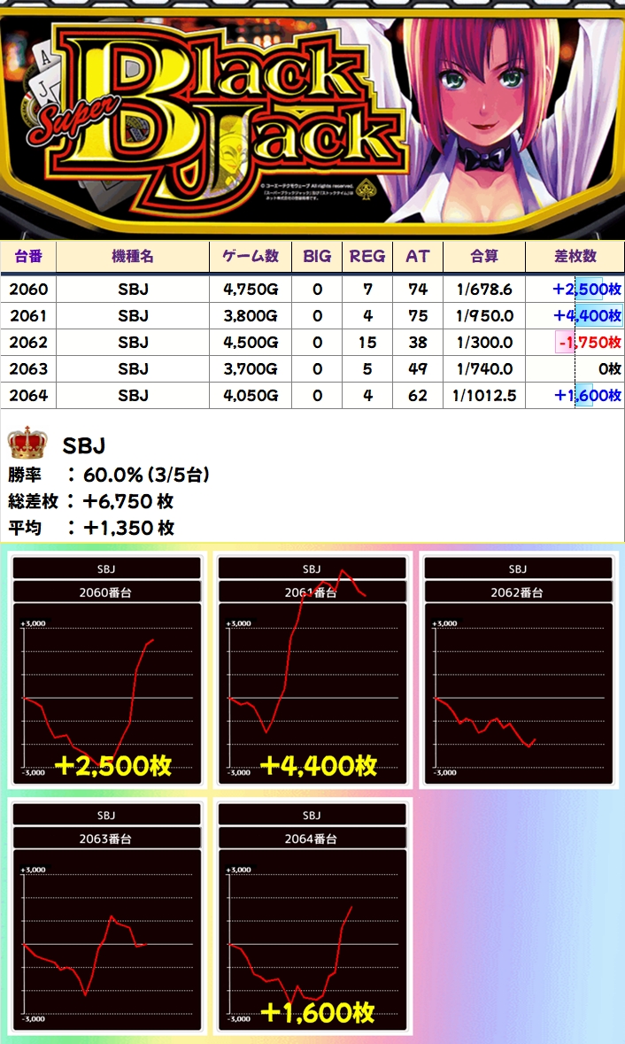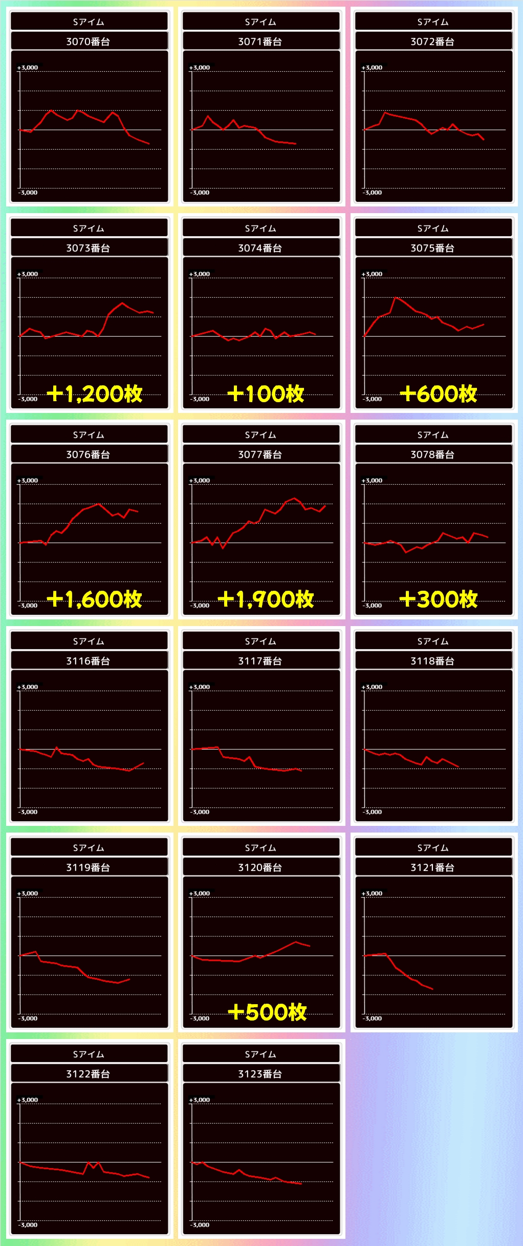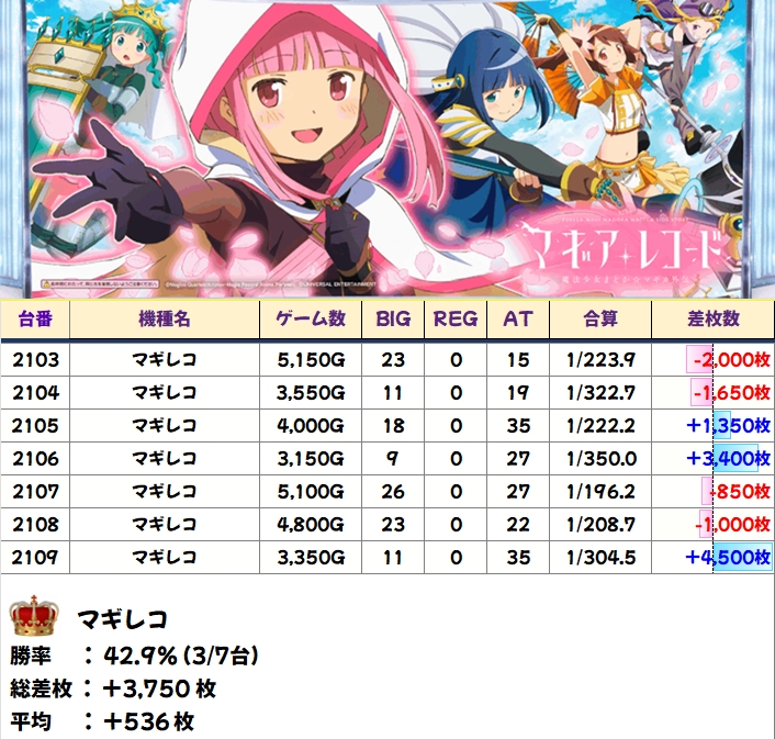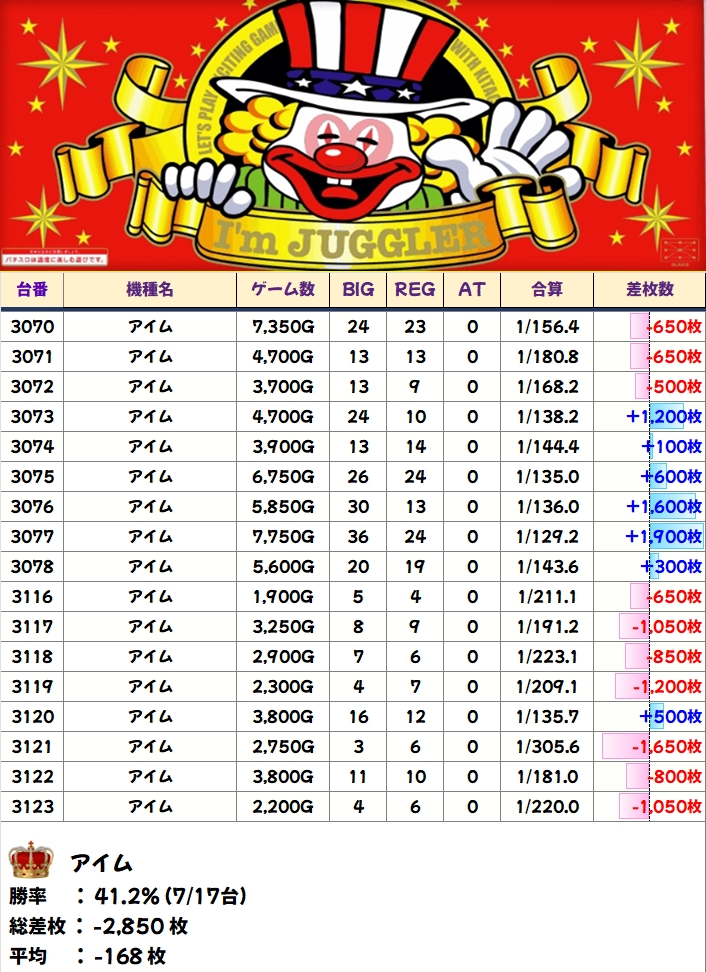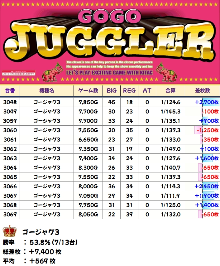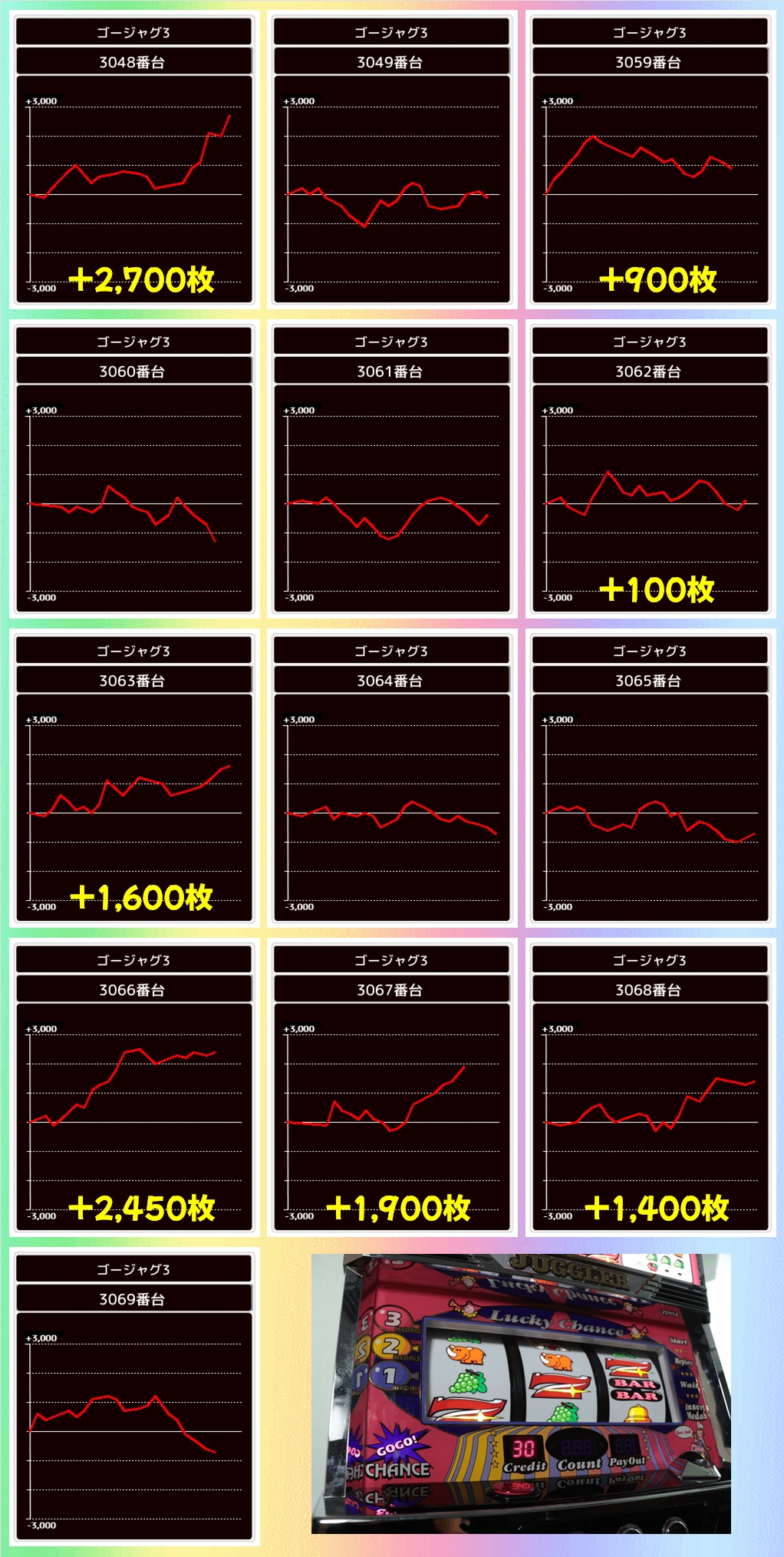 1/3系も人気ドコロに加えジャグが対象に!こちらも各機種2000枚オーバーを確認!優秀台が連続している機種が多いので、並び仕掛けがあった可能性も考えられます。