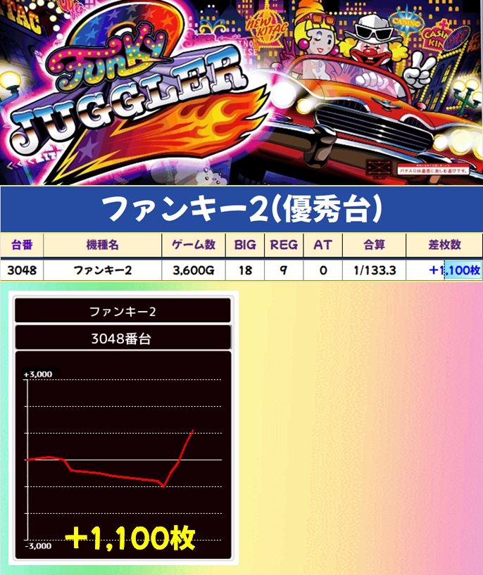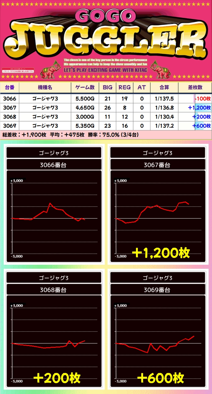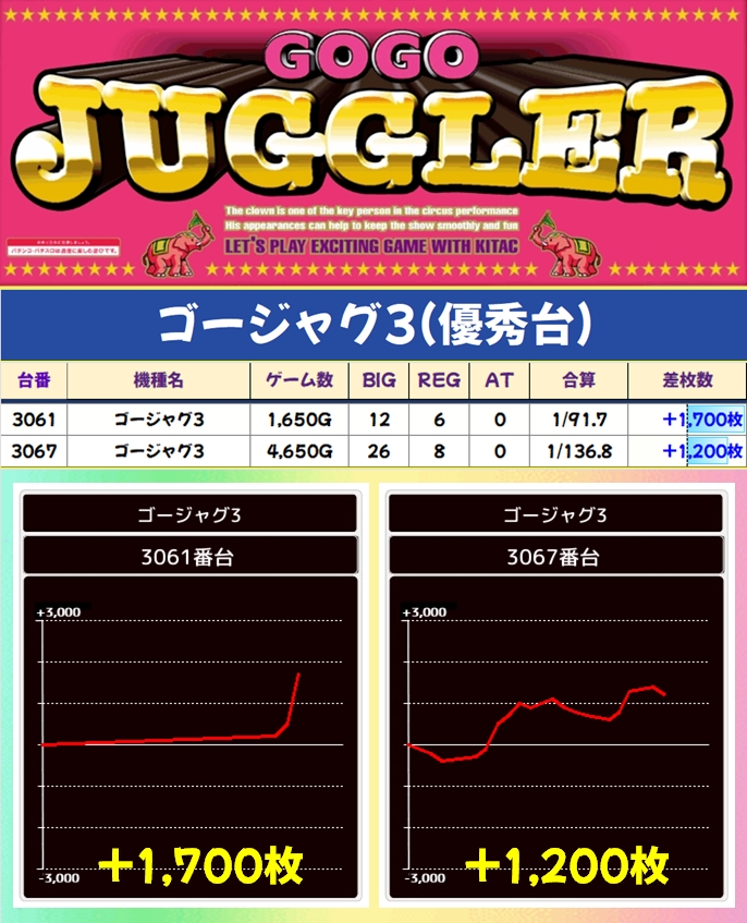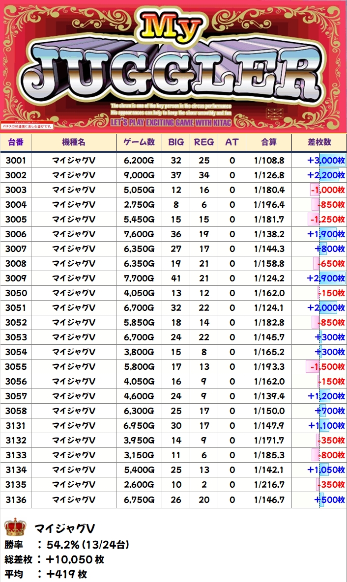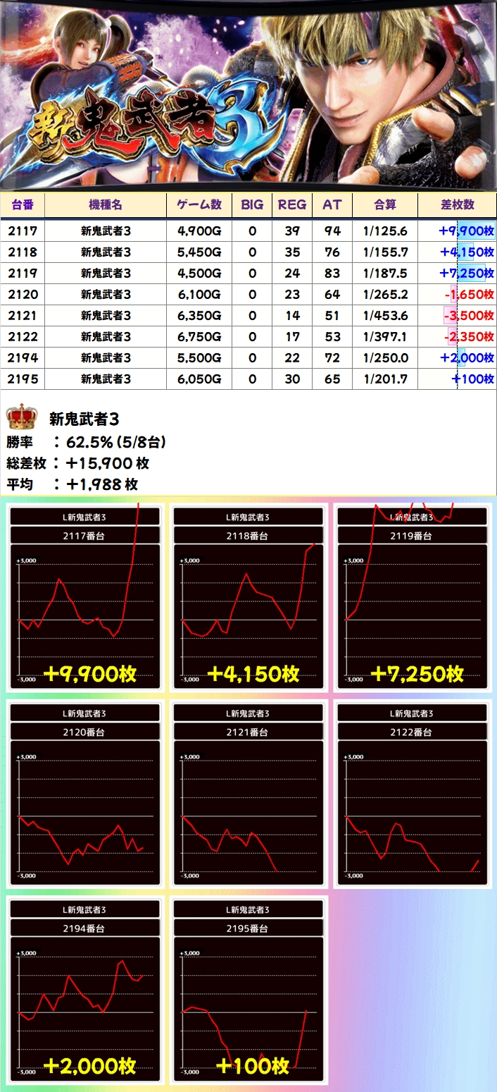 最新機種やノーマル、人気機種には高配分仕掛け!スマスロはいずれも平均1000枚超で、マイジャグも平均500枚の優秀成績!新鬼武者3もエンタの日絡みでかなり強かった可能性大!