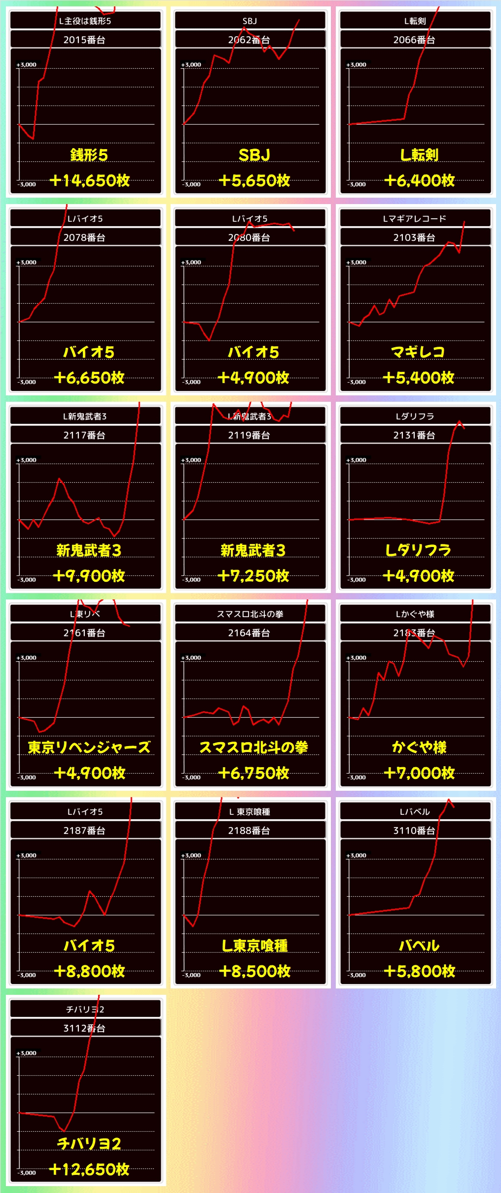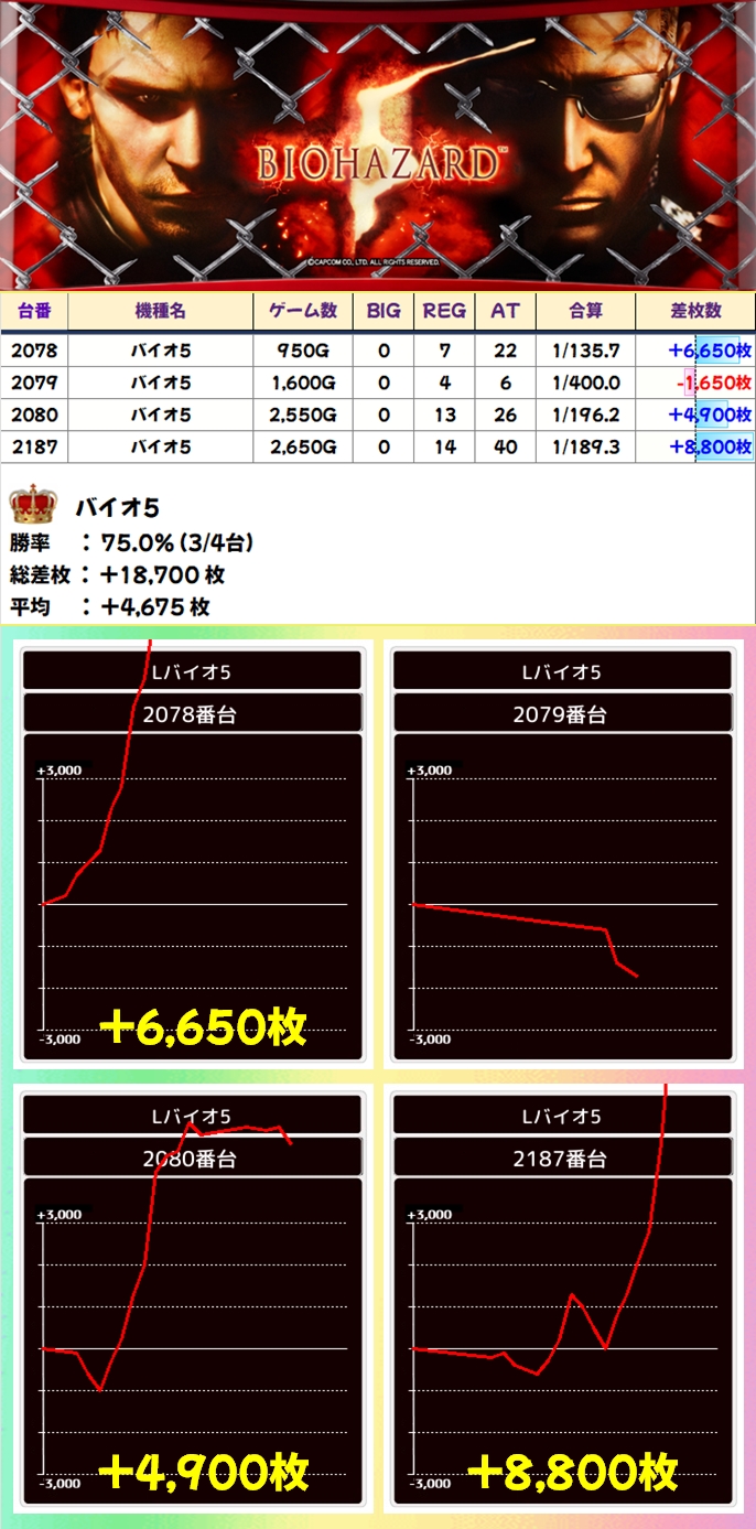 全系濃厚機種が2機種あり、バイオ5は5000枚クラスが複数と超優秀でした!10/10はエンタの日でもあったので、それ絡みでかなり強烈仕掛けだった可能性あり!