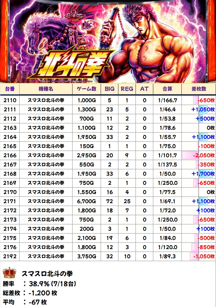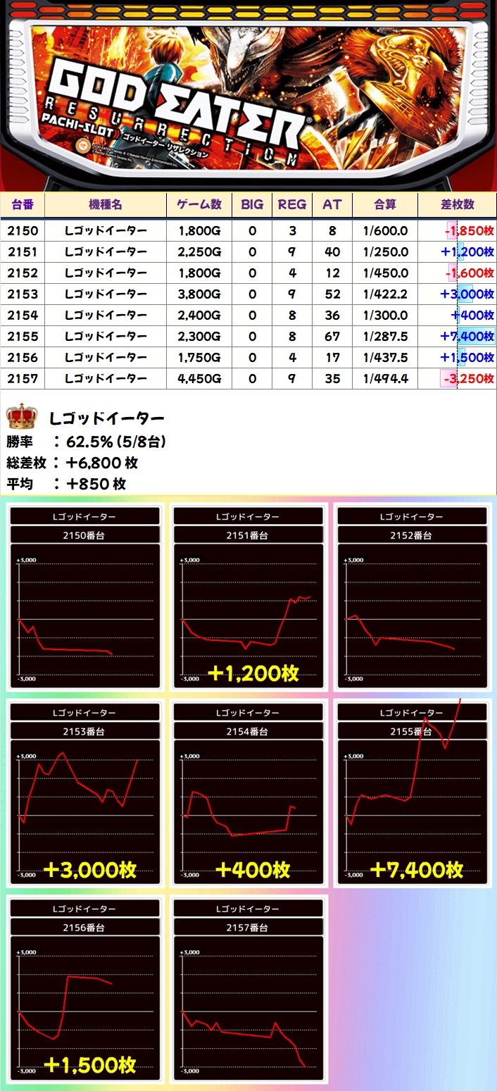 ゴッドイーターが全台系濃厚と思わしき優秀成績で、最大で7000枚超の出玉も!稼働不足台やマイナス台もあったので、周りの挙動を見て粘っていたら結果は変わっていた可能性もありますよ。