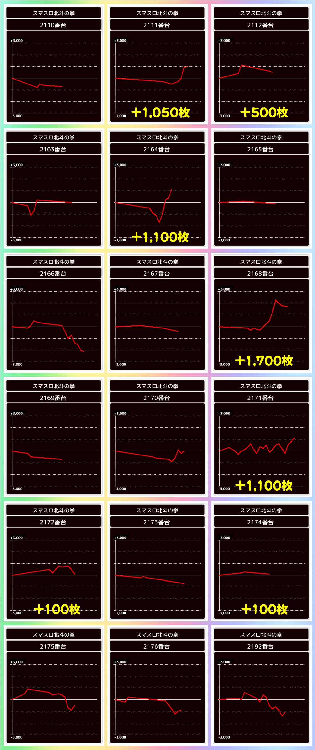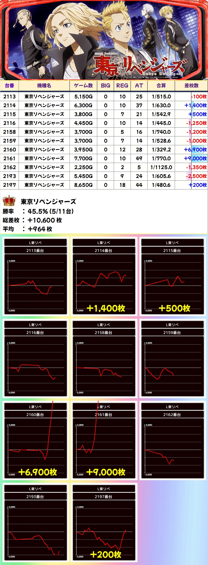 人気スマスロに高配分機種多数!SS取材が絡んでいたこともあり5機種にお宝台を確認!ダリフラは前回のゾロ目の日も高配分以上で、東リべや北斗など台数の多い台も輝かしい結果を残した台を確認できました!