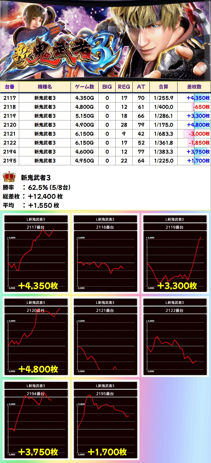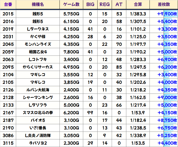 人気の喰種、新台系の新鬼3、機種名に5のつくモンキーVと人が集まりそうなところに高配分仕掛け!いずれも+2000枚超が複数あり、台平均はプラス差枚!