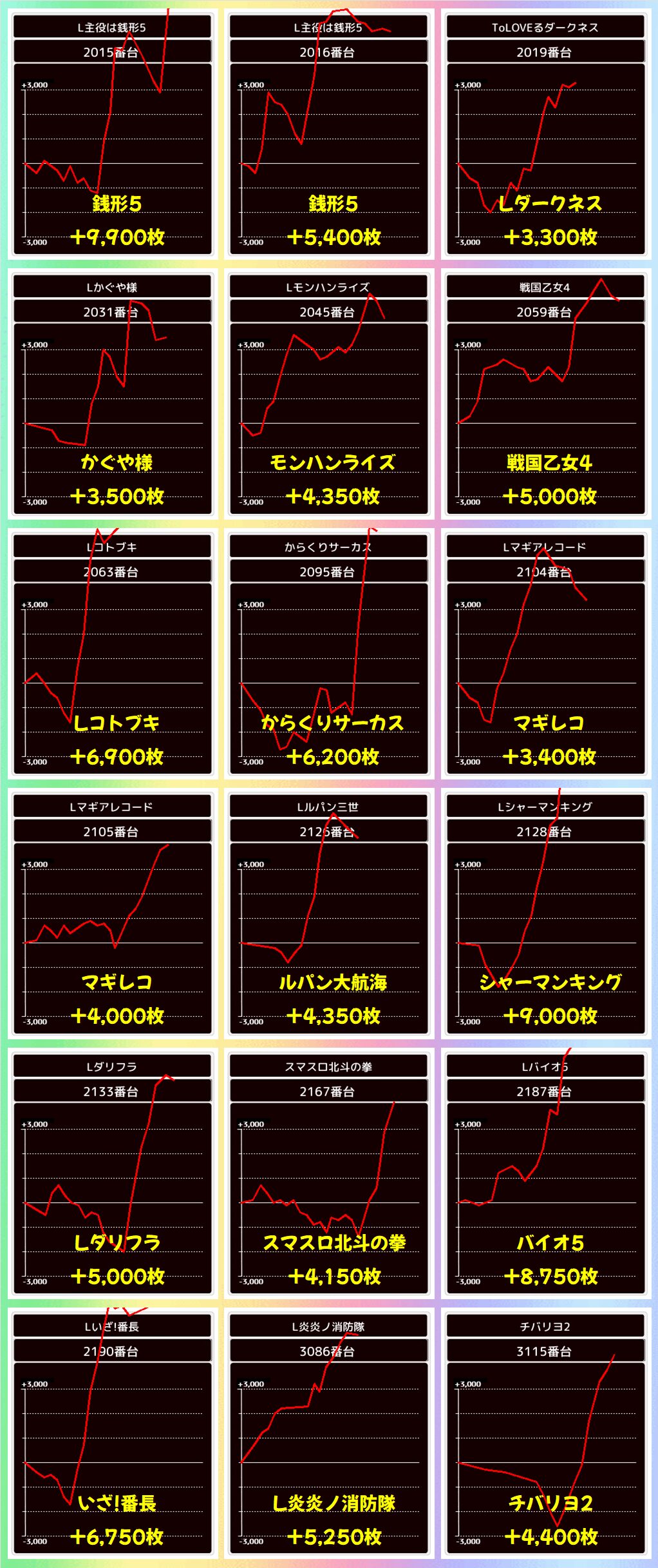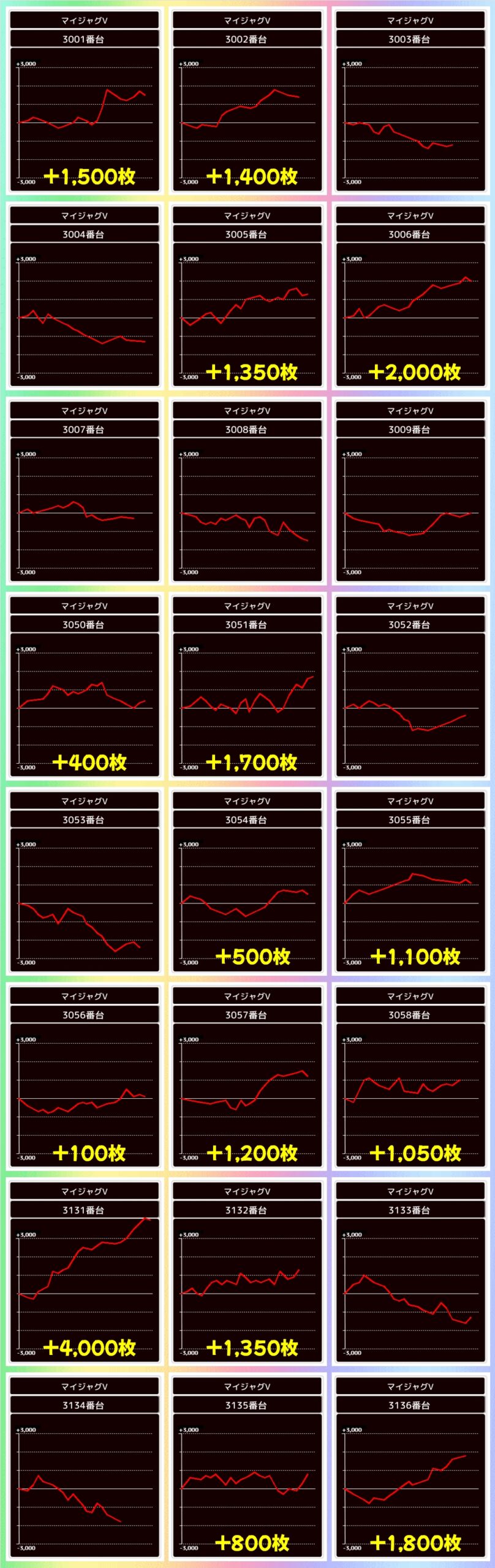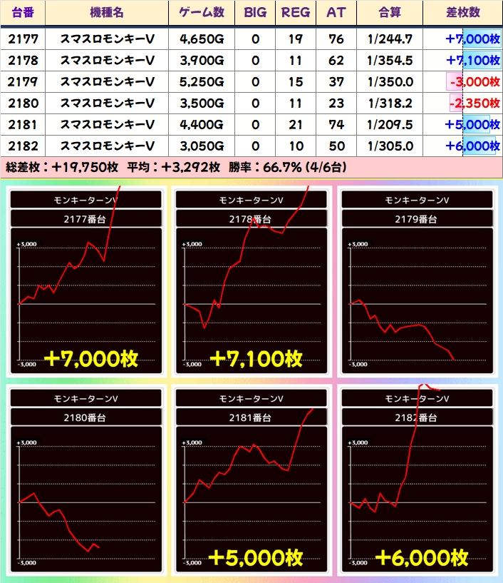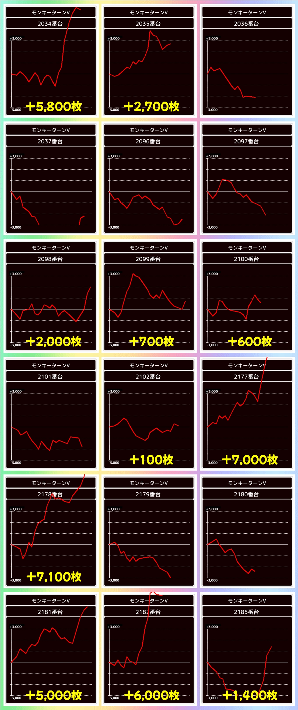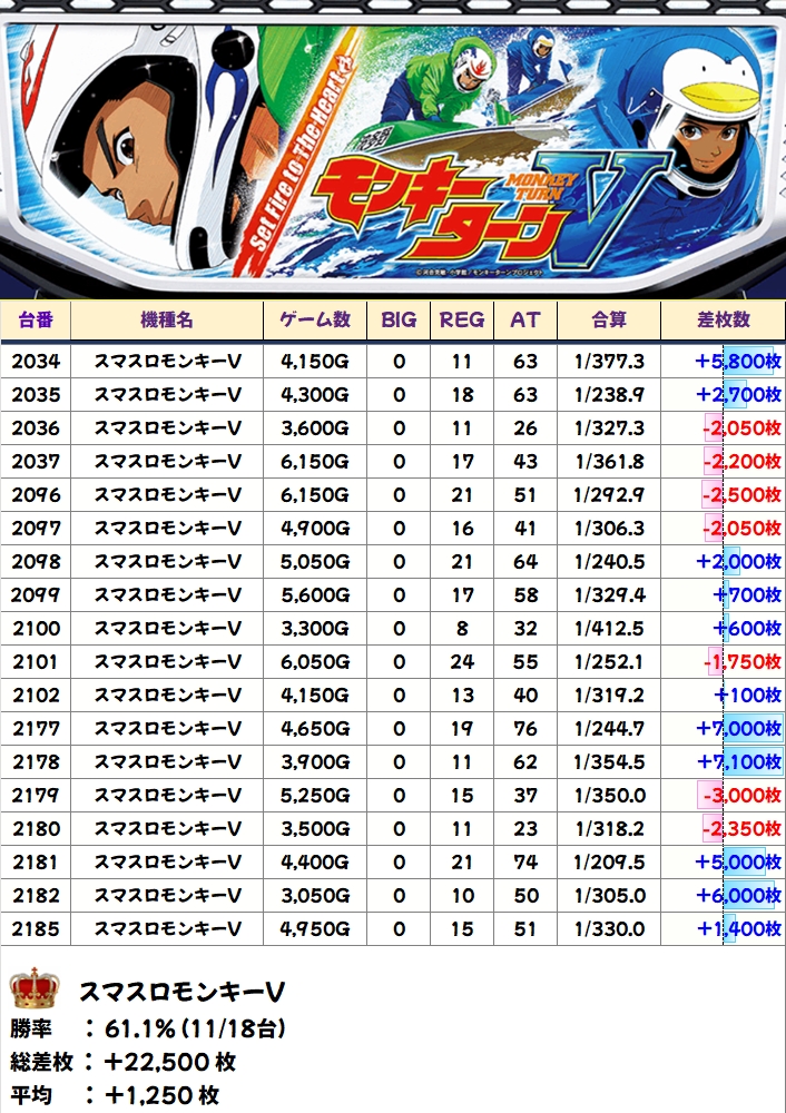 5のつく日というのもあってかモンキーVには列全仕掛けも!マイナス台はあるものの多くが5000枚以上を獲得!並びや列全仕掛けが絡むことも多いので、優秀台を見つけたらまずは両サイドが狙い目です!