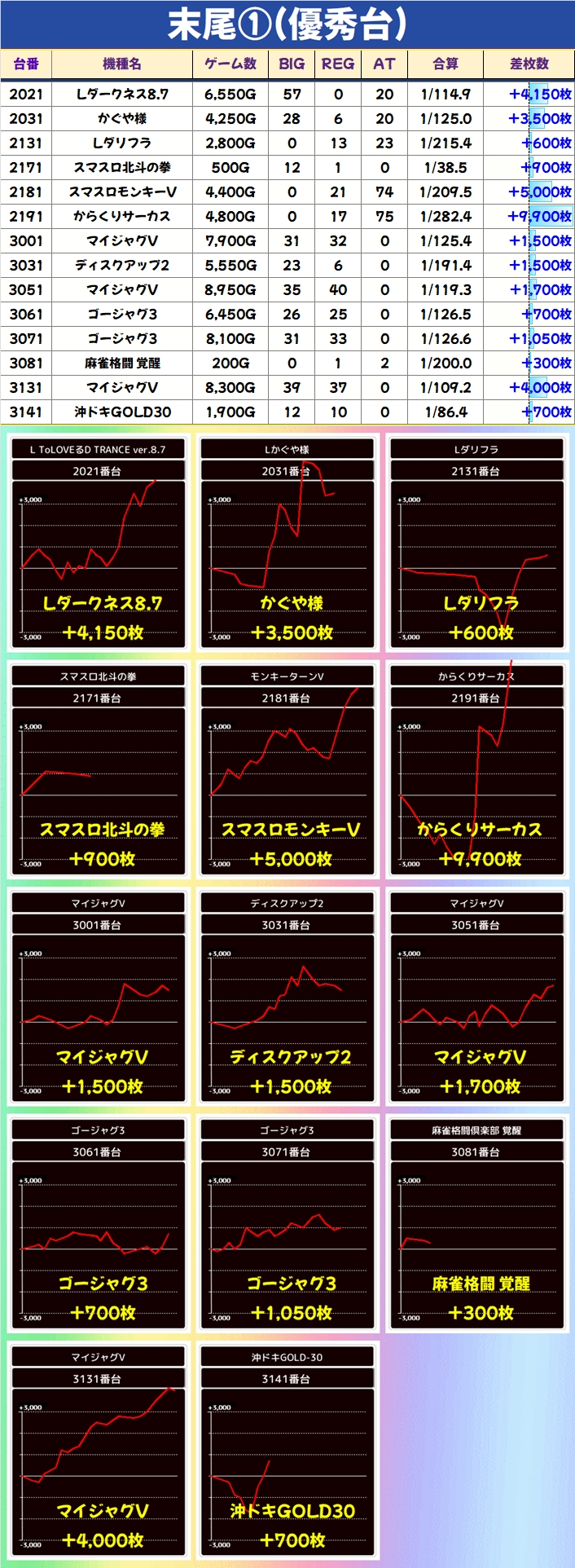 これまでジャグに優秀末尾が仕掛けられることが多かった25日ですが、今回は全体で末尾①が優秀に!新ポスターになったことで今後もジャグ以外にも優秀になる可能性があるので、次回以降も末尾は要チェック!