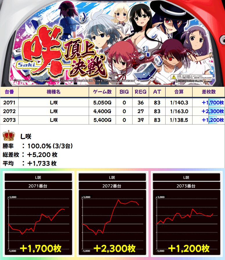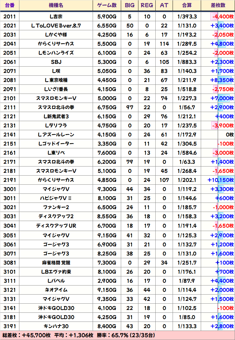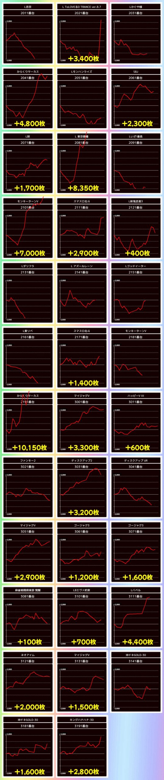 本日の全台系濃厚機種は上記の5機種!末尾だけでなく上質な全台系も用意されており、土曜日の強さが感じ取れます!いずれも勝率・差枚ともに優秀な結果に!